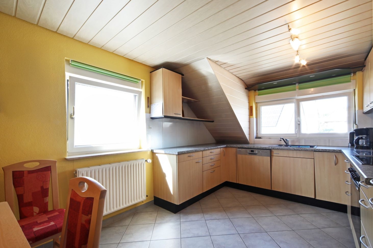- Wohnküche: Bodenfliesen, Tapete, Holzdecke, Einbauküche