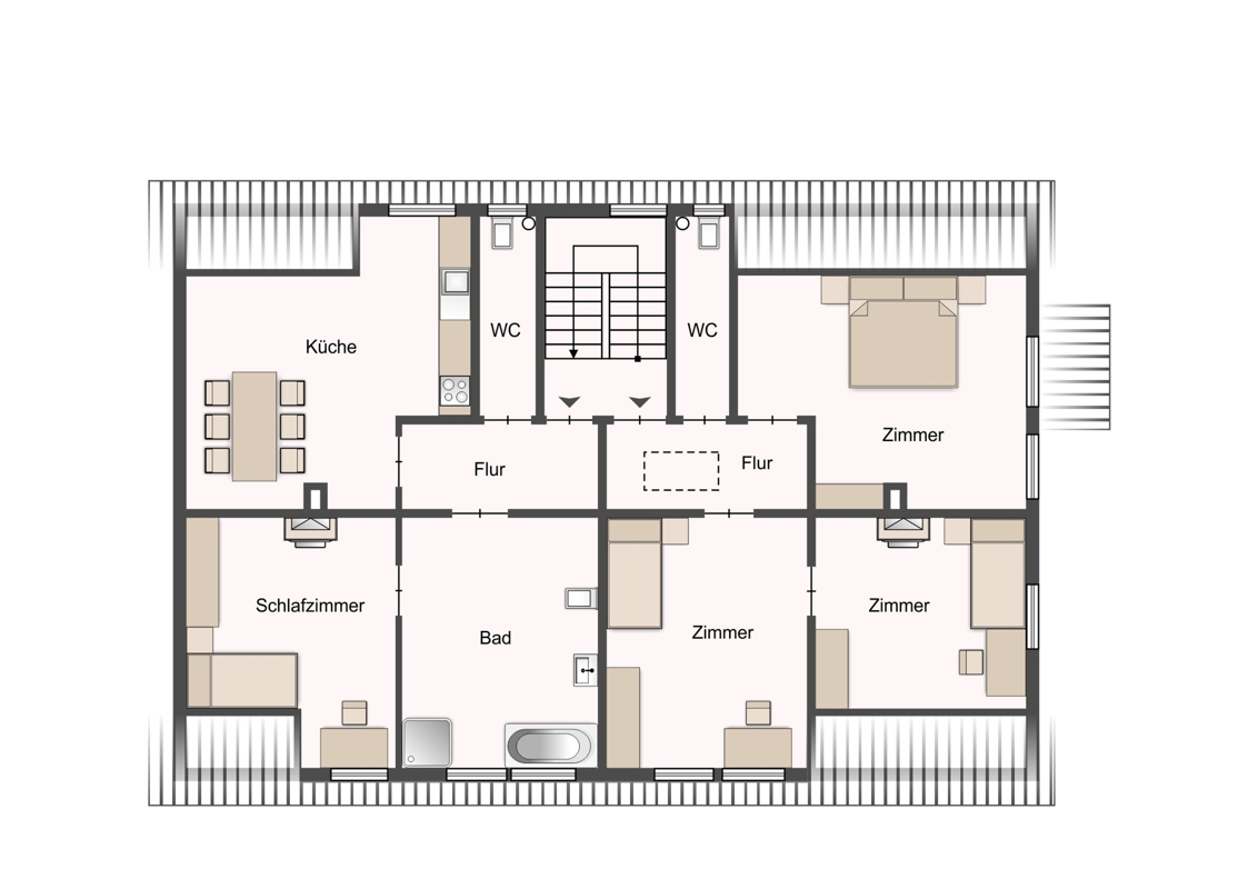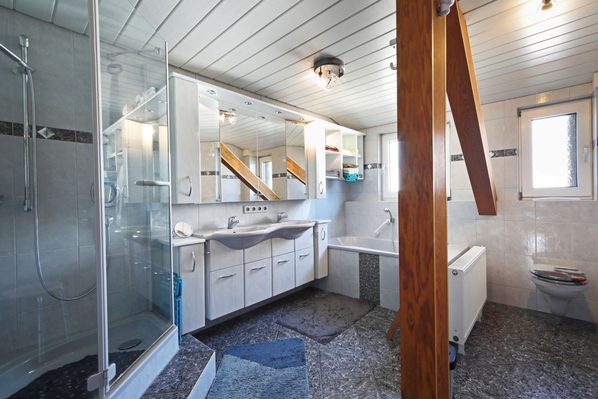 - Bad: Boden- und Wandfliesen, Holzdecke, Doppel-Waschtisch, Dusche, Badewanne, WC