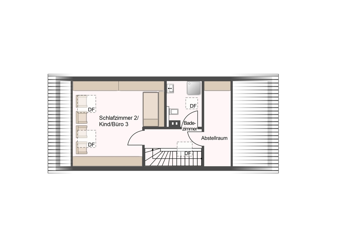 Im Dachgeschoss erwartet Sie ein weiteres großzügiges Zimmer: möglich als weiteres Schlafzimmer, Kinderzimmer oder Büro, sowie ein weiteres Badezimmer und ein zusätzlicher Abstellraum unter dem Dach.