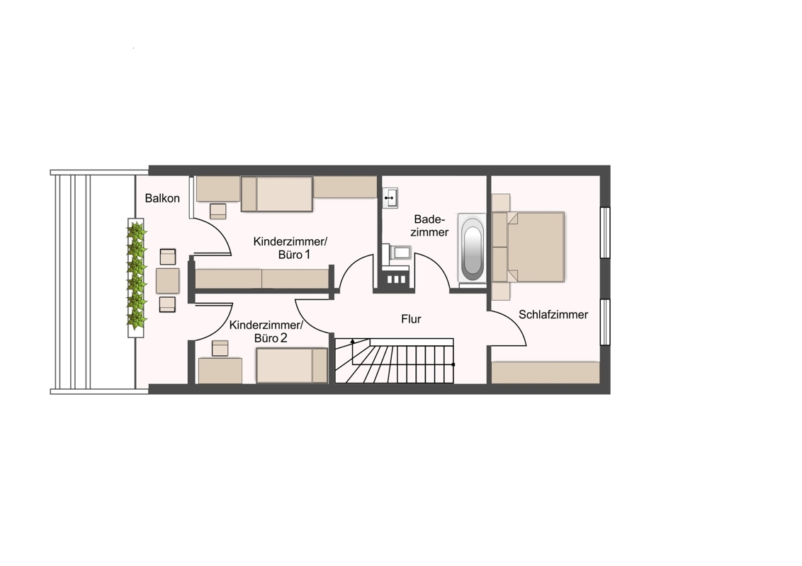Im Obergeschoss befinden sich drei gut geschnittene Zimmer, zwei davon mit Zugang zum Balkon, die sich flexibel als Schlaf-, Kinder-, Arbeits- oder Gästezimmer gestalten lassen.