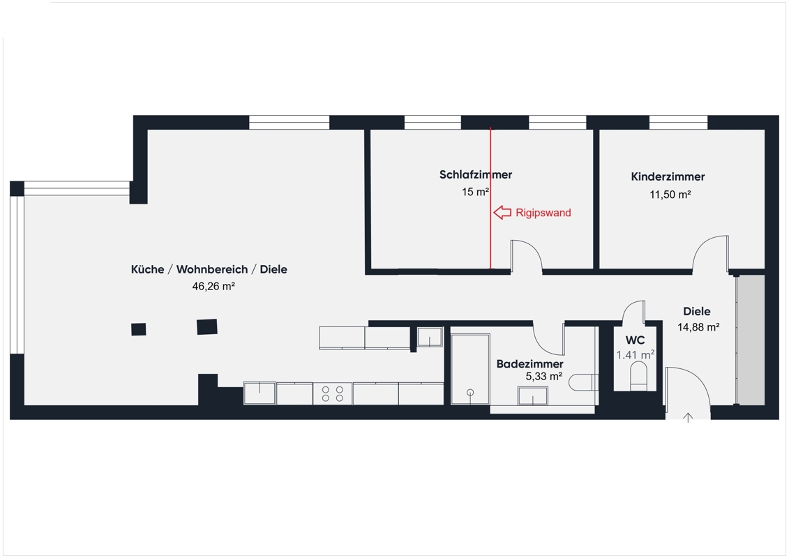 Diese gepflegte und lichtdurchflutete Wohnung im Hochparterre überzeugt mit einer großzügigen Wohnfläche von ca. 94 m² sowie einem modernen und komfortablen Wohnambiente. Der durchdachte Grundriss umfasst derzeit vier Zimmer, lässt sich jedoch mit geringem Aufwand in eine attraktive 3-Zimmer-Wohnung umgestalten. Das ursprüngliche Schlafzimmer wurde von den Eigentümern zugunsten zweier Kinderzimmer durch eine leichte Rigipswand geteilt. Diese kann bei Bedarf problemlos wieder entfernt werden, sodass ein großzügiges und vielseitig nutzbares Zimmer entsteht.Der großzügige Wohn- und Essbereich mit offener Küche und angrenzendem Wintergarten bildet das Herzstück der Wohnung. Dank der großen Fensterfronten ist dieser Bereich lichtdurchflutet und schafft eine freundliche, einladende Atmosphäre. Die offene Küche mit Einbaugeräten ist sowohl funktional als auch ansprechend gestaltet.