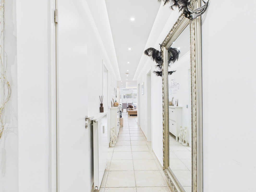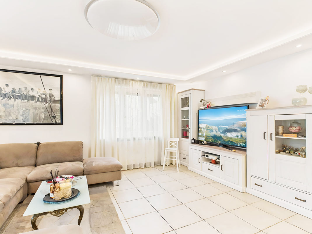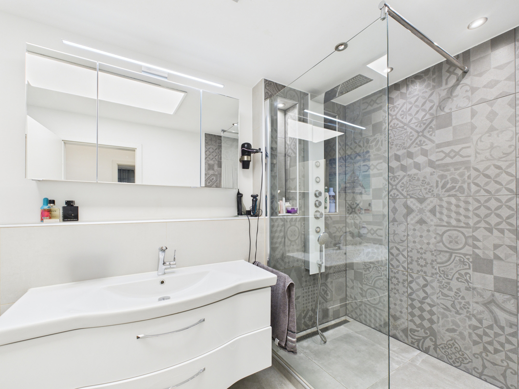 Nach Umgestaltung entstehen zwei gemütliche Schlafzimmer und bieten so ausreichend Rückzugsmöglichkeiten für die ganze Familie. Das Badezimmer mit großer, bodenebener Dusche, Doppelwaschbecken, WC und Bidet sowie ein separates Gäste-WC sorgen für zusätzlichen Komfort im Alltag.