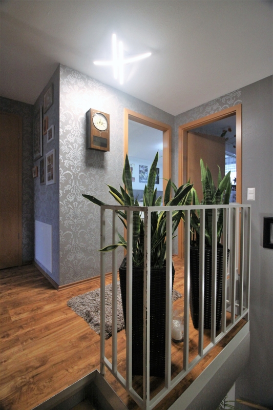 Das Obergeschoss erreichen Sie über eine mit Holzstufen besetzten offene Treppe.
