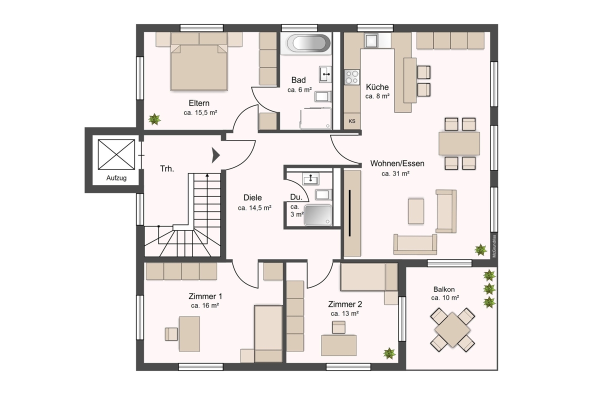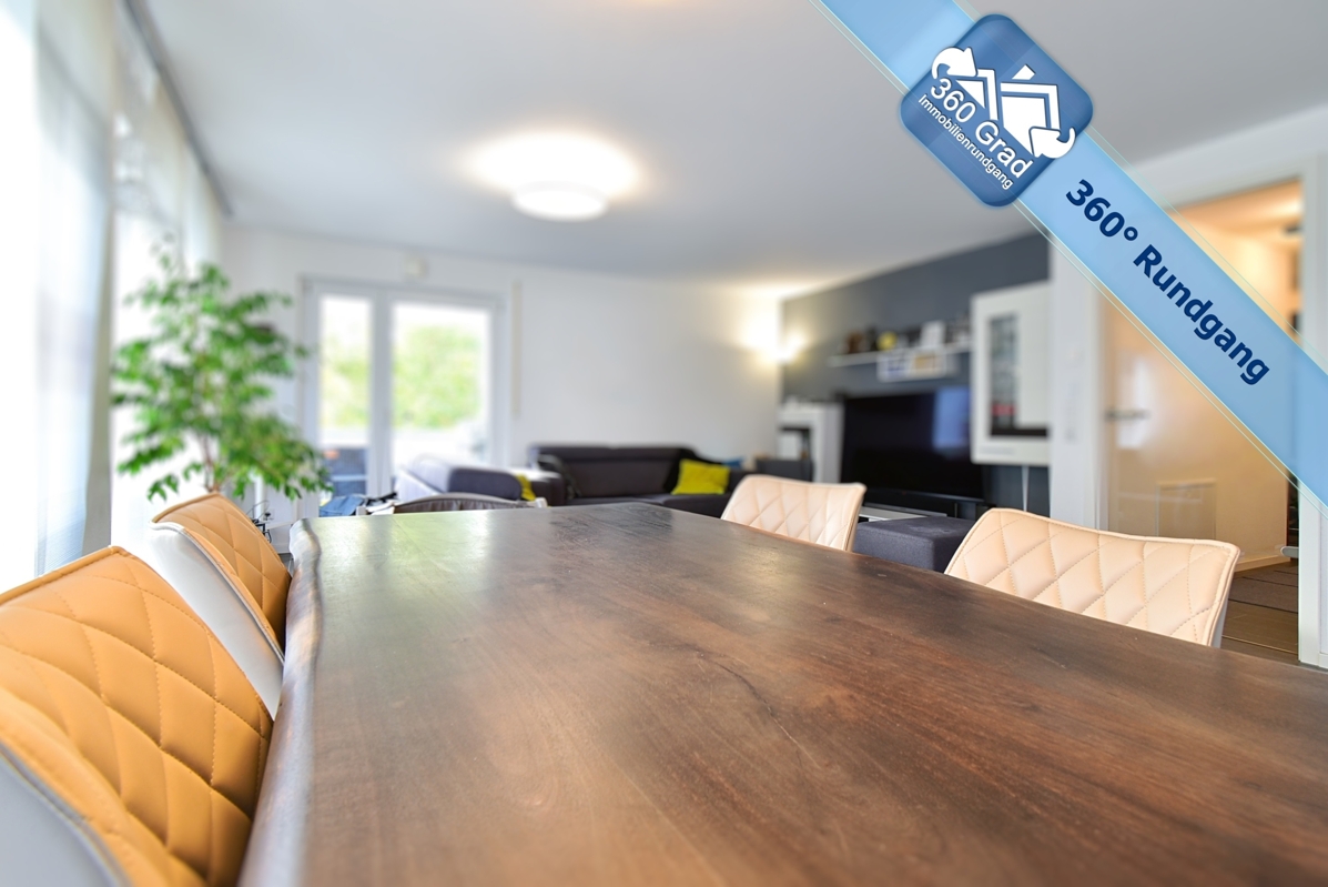 Einen großzügigen Wohn-/ Essbereich mit offenener Küche inkl. hochwertiger Einbauküche, das Eltern-Schlafzimmer mit Tageslichtbad en suite, ist mit einer Badewanne, Dusche, Waschbecken und WC ausgestattet, zwei Kinder- oder Arbeitszimmer, ein separates Gästebad mit Dusche, Waschbecken und WC, den durchdachten Dielenbereich und dem überdachten Balkon.
