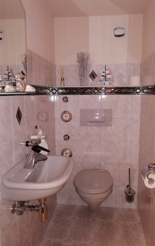 -separates Gäste-WC mit Waschbecken, Boden gefliest, Wand ½ -hoch gefliest