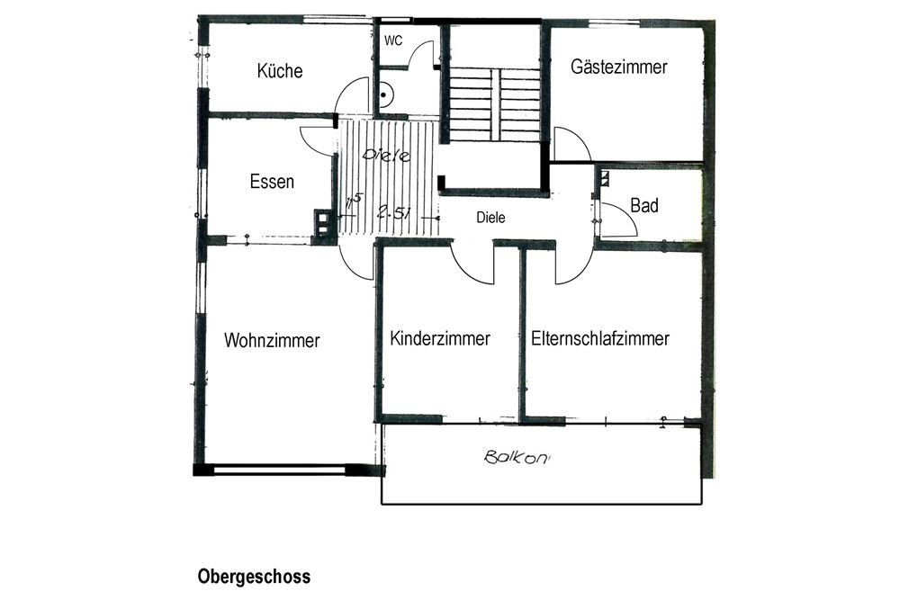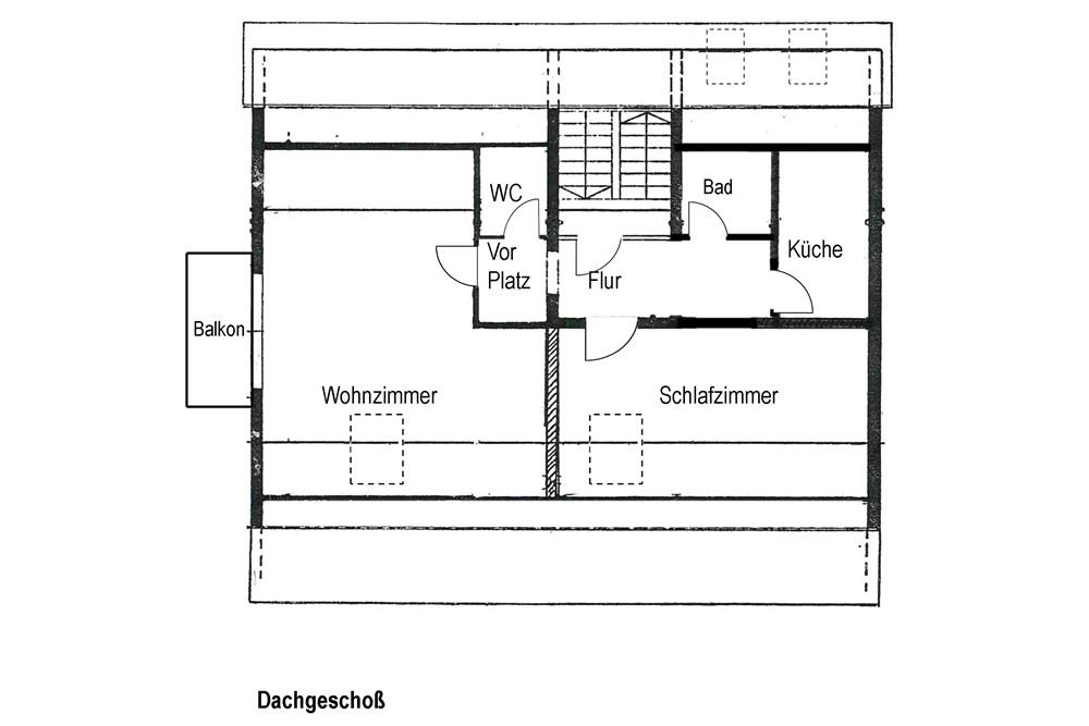 mit großem Wohn-Esszimmer, Schlafzimmer, Küche (EBK), WC sep. und Bad mit Wanne, Waschbecken beides mit Tageslicht. Balkon auf der Westseite. Das Bad ist renovierungsbedürftig. Bodenbeläge in den Wohnräumen mit Parkett.
