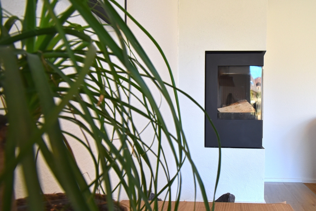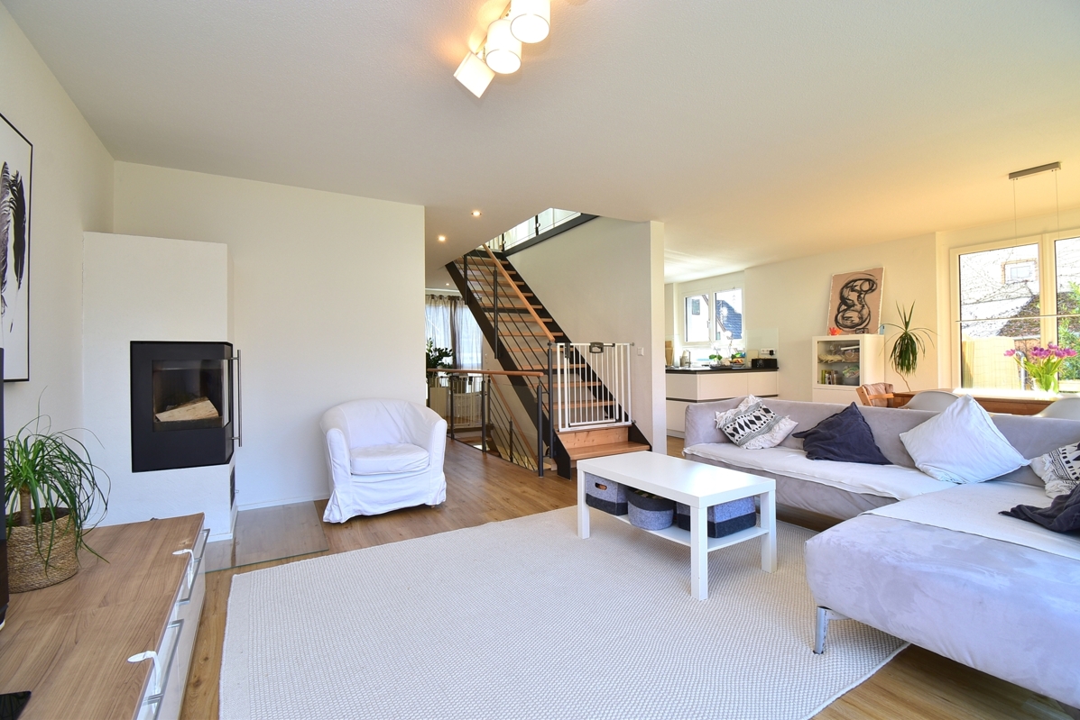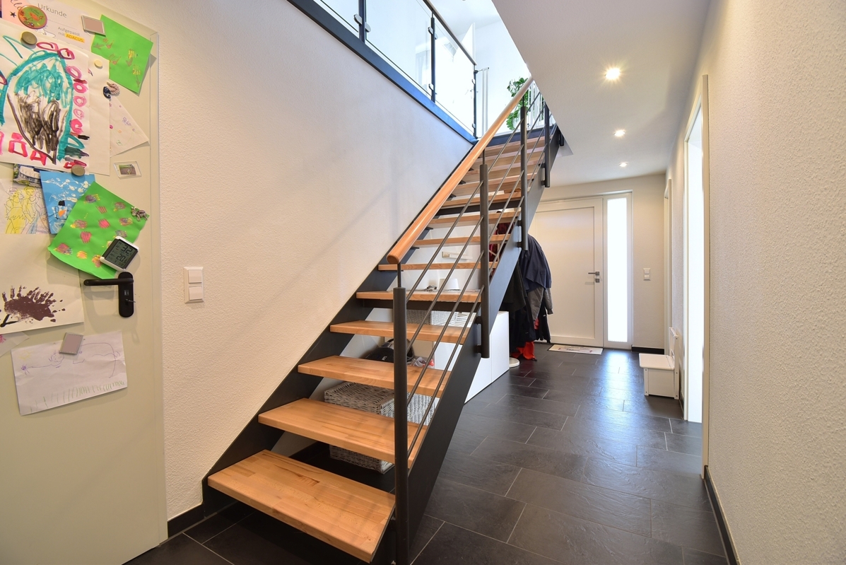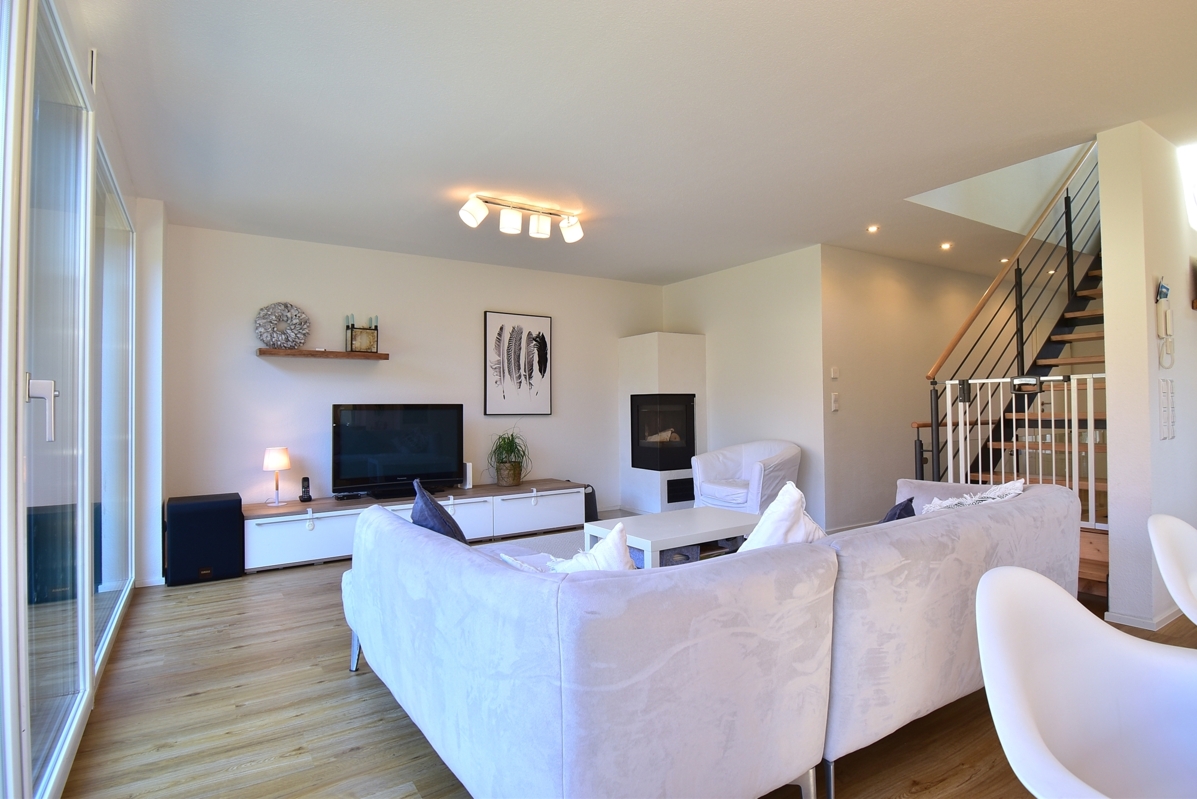 Über die offene Treppenanlage, mit Tritten aus Buchenholz, gelangen Sie ins Erdgeschoss. Ein geräumiger Flur führt Sie in das Arbeitszimmer und in den größten Raum des Hauses. Auf 40 m² wurde hier Wohnen-/ Essen und Kochen vereint. Die moderne Einbauküche ist mit einer Arbeitsplatte aus Nero Assoluto Naturstein und hochwertigen Elektro-Geräten ausgestattet. Im Wohnbereich läd ein Olsberg-Qualitäts-Kaminofen zu schönen Stunden im Winter ein. Das Erdgeschoss verfügt noch über ein Tageslicht Gäste-WC. Absolutes Highligt ist die komplett verglaste Wand in Richtung Garten & Terrasse. Durch eine Flügeltüre gelangen Sie in den Außenbereich.
