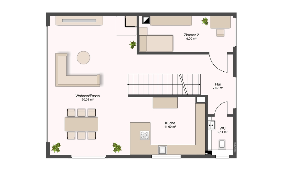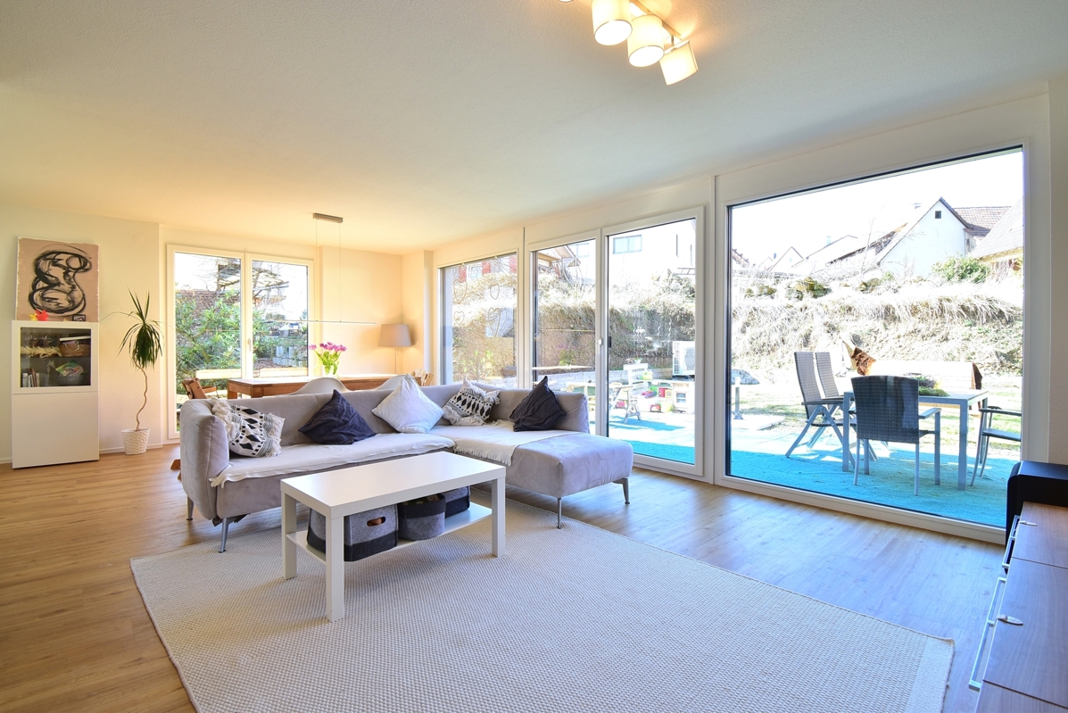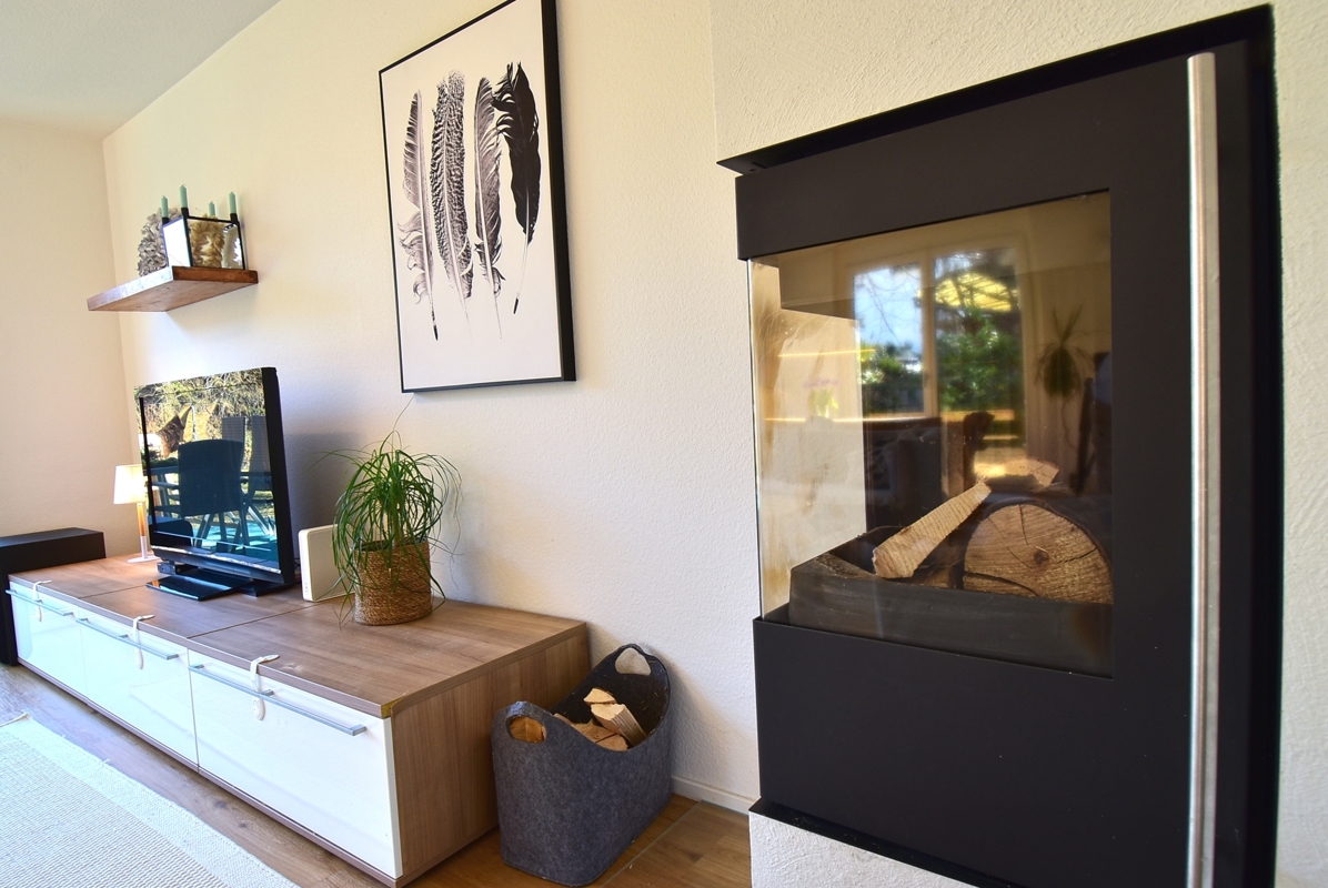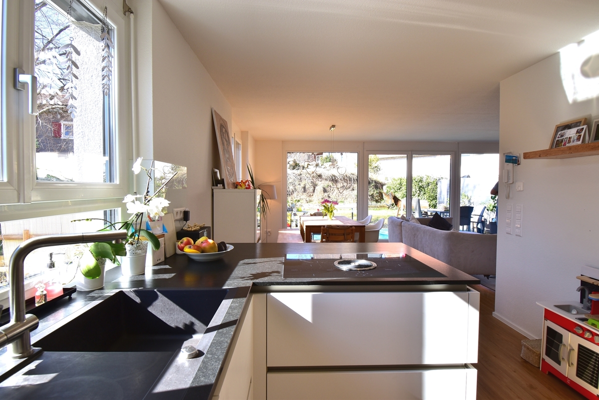 Über die offene Treppenanlage, mit Tritten aus Buchenholz, gelangen Sie ins Erdgeschoss. Ein geräumiger Flur führt Sie in das Arbeitszimmer und in den größten Raum des Hauses. Auf 40 m² wurde hier Wohnen-/ Essen und Kochen vereint. Die moderne Einbauküche ist mit einer Arbeitsplatte aus Nero Assoluto Naturstein und hochwertigen Elektro-Geräten ausgestattet. Im Wohnbereich läd ein Olsberg-Qualitäts-Kaminofen zu schönen Stunden im Winter ein. Das Erdgeschoss verfügt noch über ein Tageslicht Gäste-WC. Absolutes Highligt ist die komplett verglaste Wand in Richtung Garten & Terrasse. Durch eine Flügeltüre gelangen Sie in den Außenbereich.