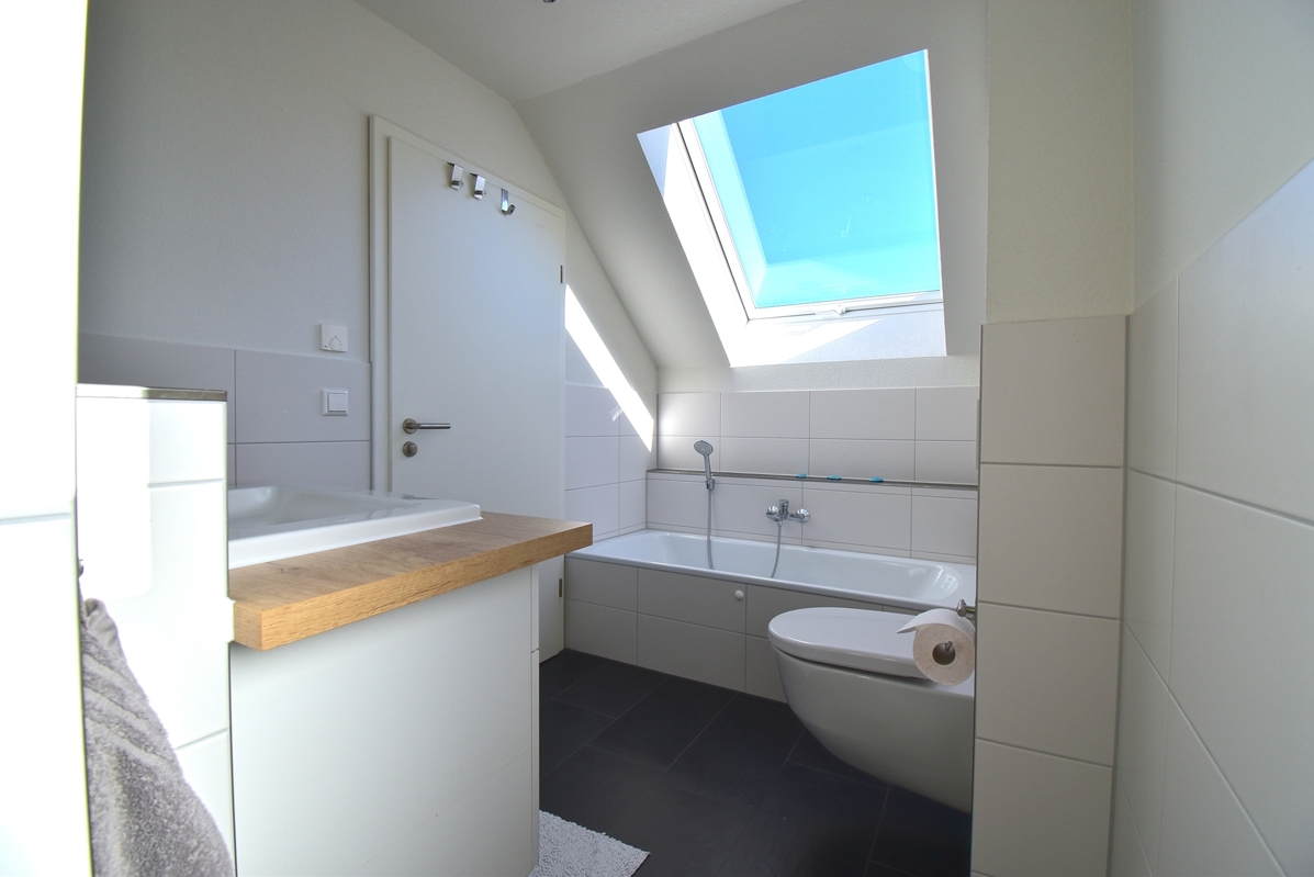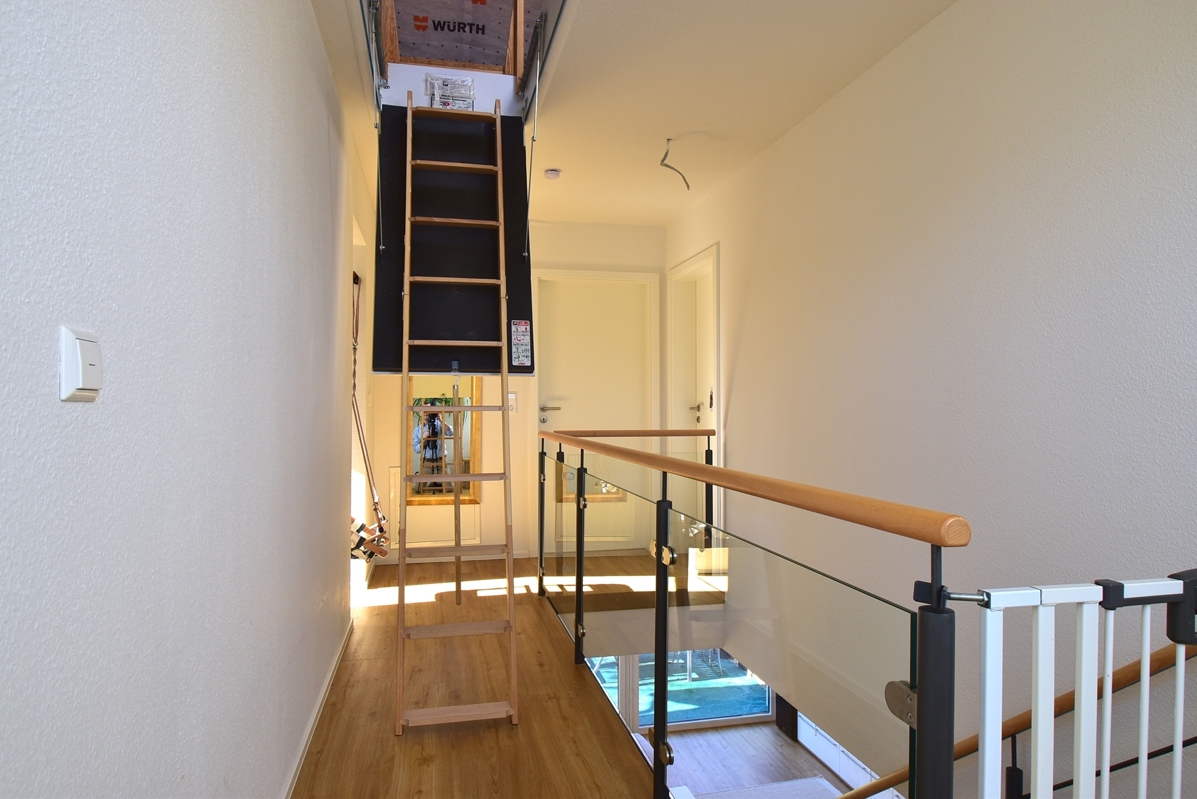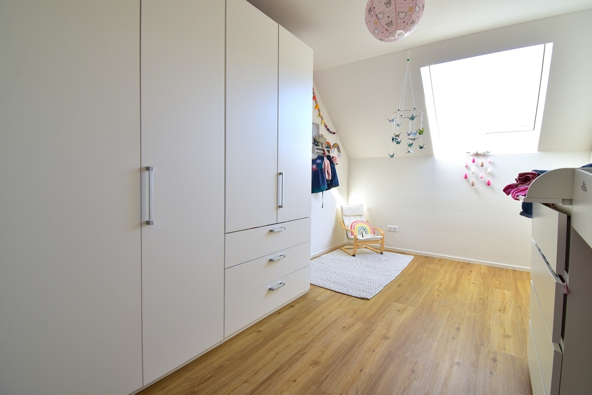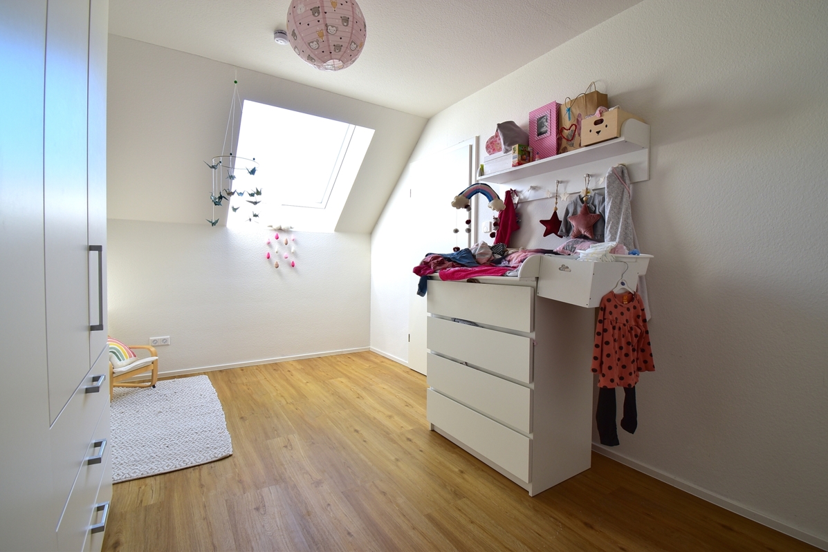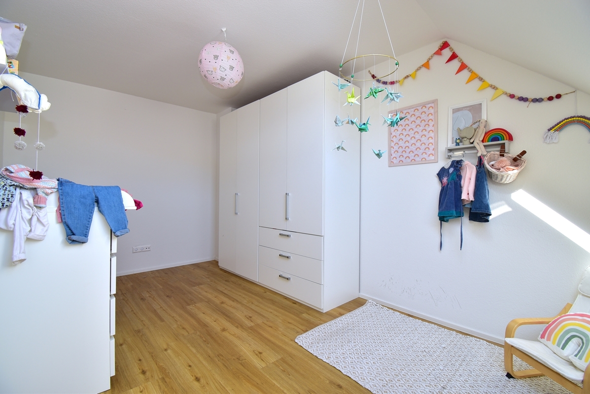 Diese Ebene ist ganz dem privaten Gebrauch gewidmet. Hier finden Sie zwei gleich große Kinderzimmer sowie ein geräumiges Elternschlafzimmer. In der angrenzenden Ankleide haben Sie genug Stauraum für Ihre Garderobe. Abgerundet wird das Raumangebot im Obergeschoss durch ein praktisch geschnittenes Tageslichtbad mit einer begehbaren Dusche, Badewanne und großem Waschbecken.