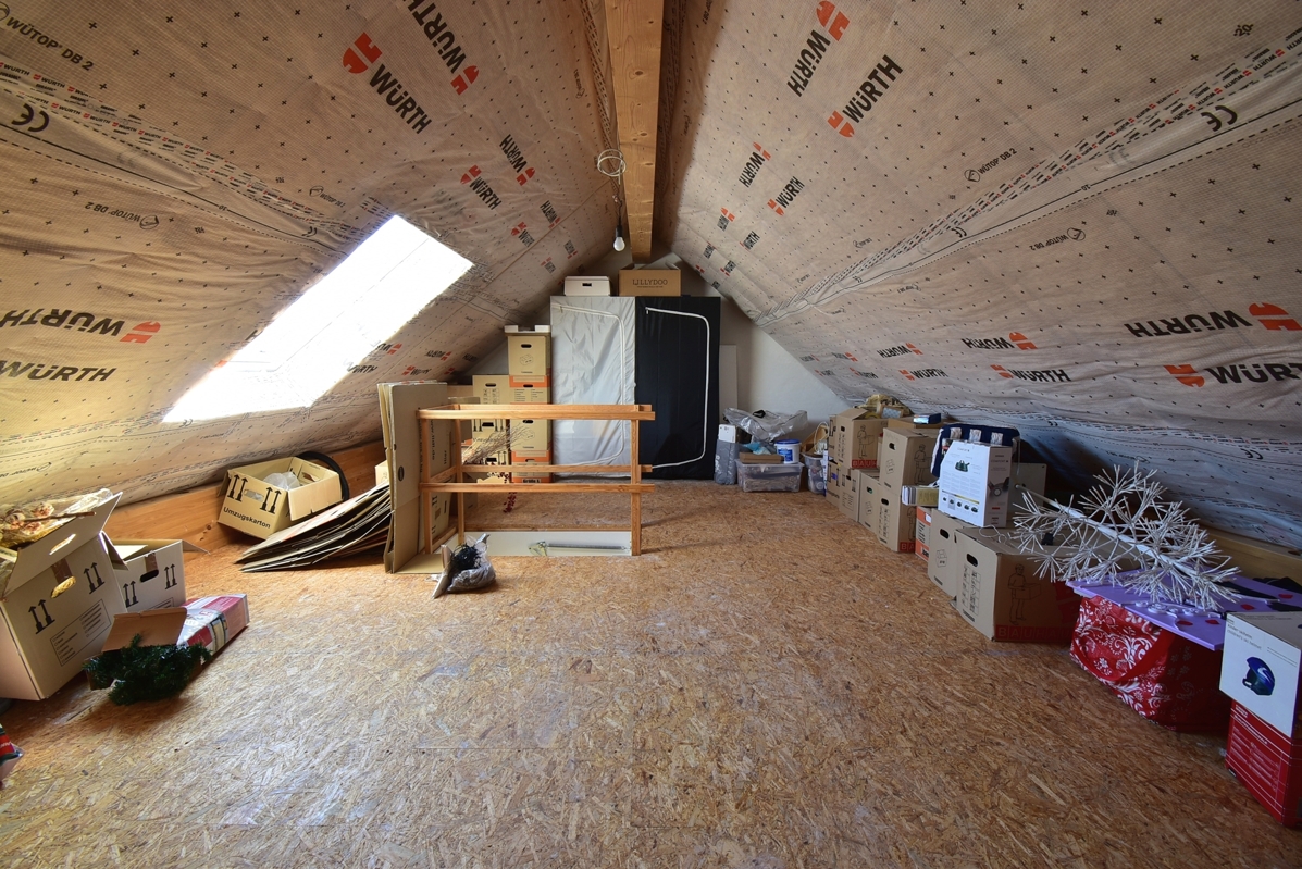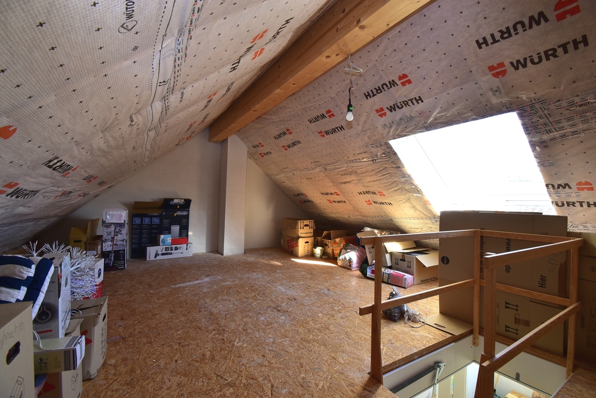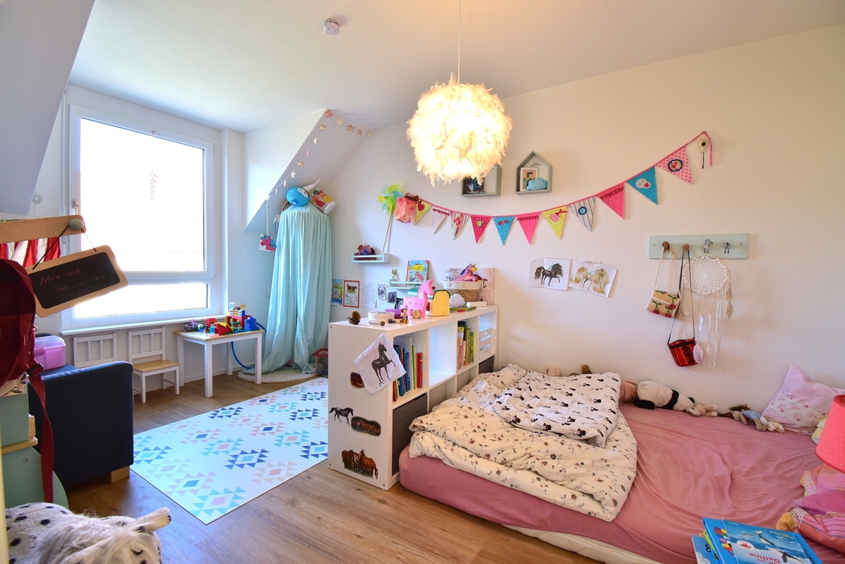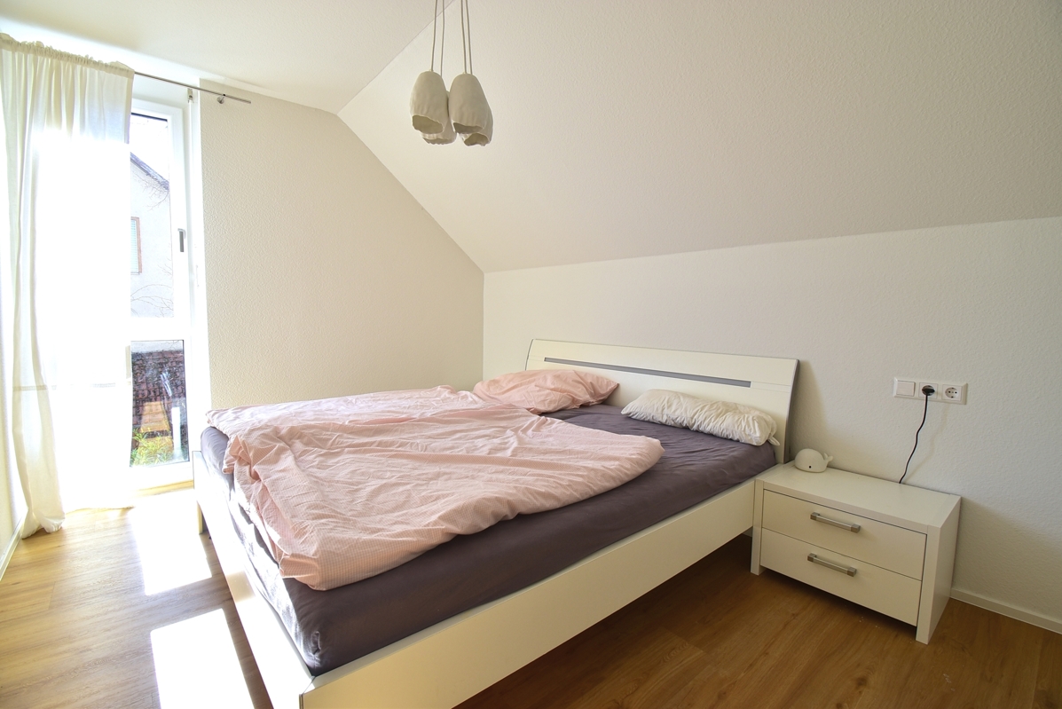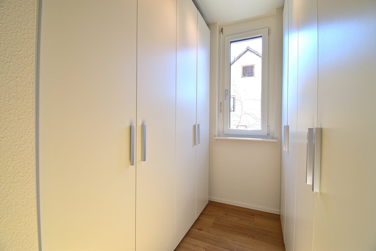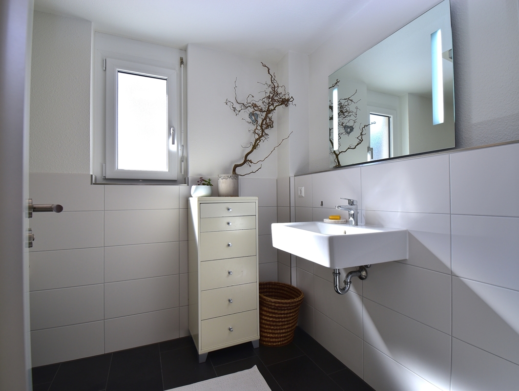 Diese Ebene ist ganz dem privaten Gebrauch gewidmet. Hier finden Sie zwei gleich große Kinderzimmer sowie ein geräumiges Elternschlafzimmer. In der angrenzenden Ankleide haben Sie genug Stauraum für Ihre Garderobe. Abgerundet wird das Raumangebot im Obergeschoss durch ein praktisch geschnittenes Tageslichtbad mit einer begehbaren Dusche, Badewanne und großem Waschbecken.