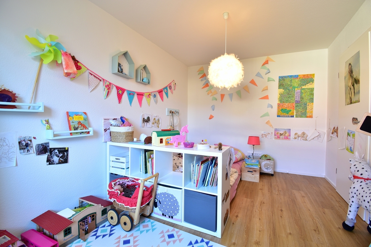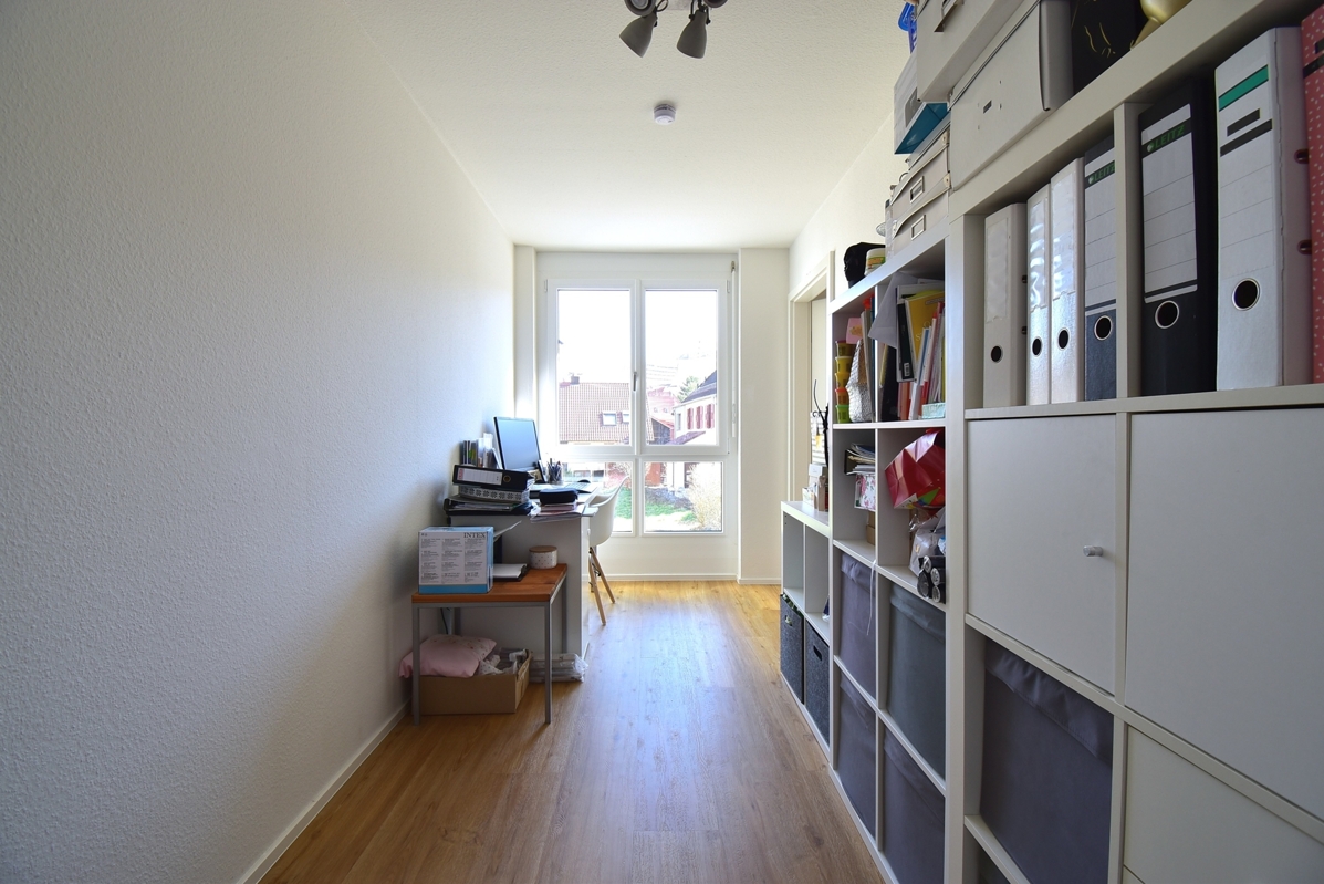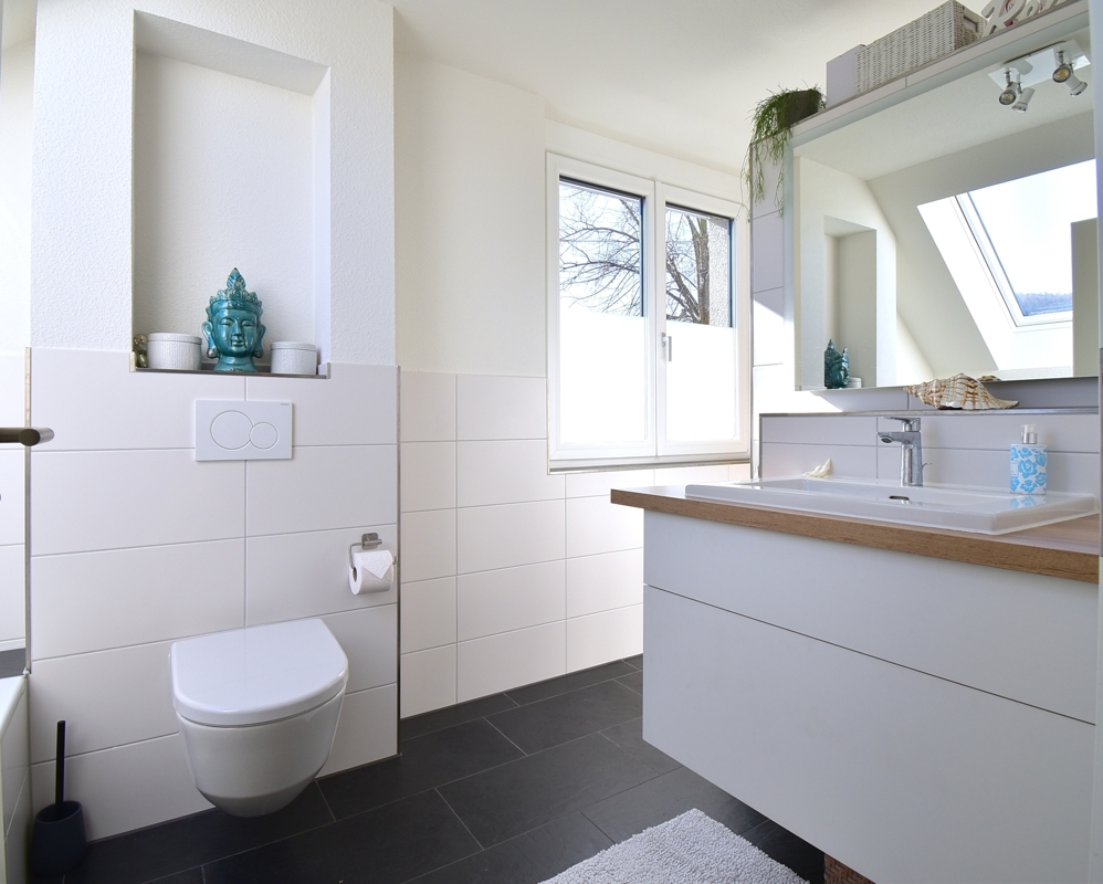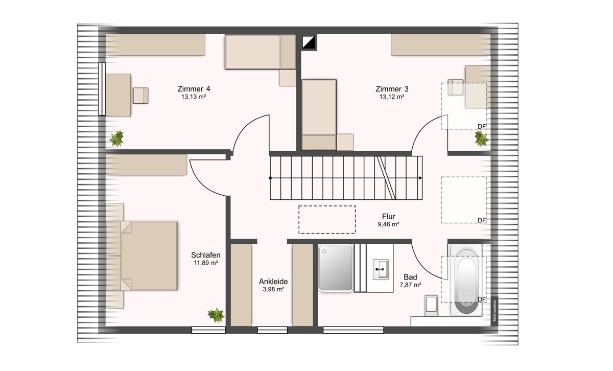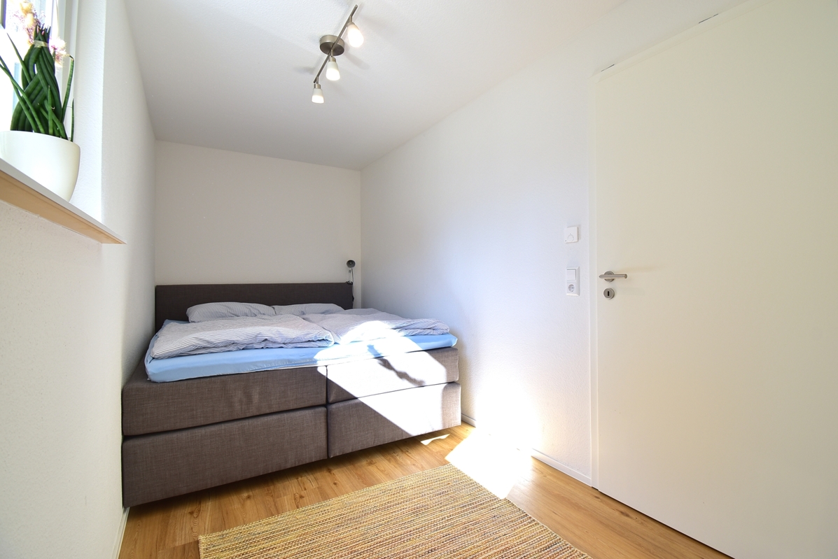 Diese Ebene ist ganz dem privaten Gebrauch gewidmet. Hier finden Sie zwei gleich große Kinderzimmer sowie ein geräumiges Elternschlafzimmer. In der angrenzenden Ankleide haben Sie genug Stauraum für Ihre Garderobe. Abgerundet wird das Raumangebot im Obergeschoss durch ein praktisch geschnittenes Tageslichtbad mit einer begehbaren Dusche, Badewanne und großem Waschbecken.
