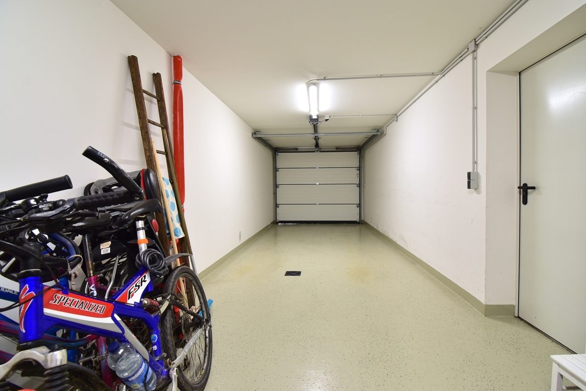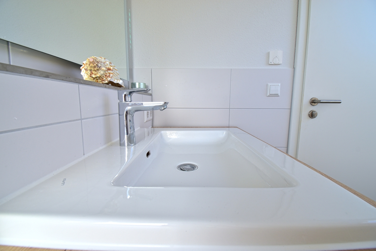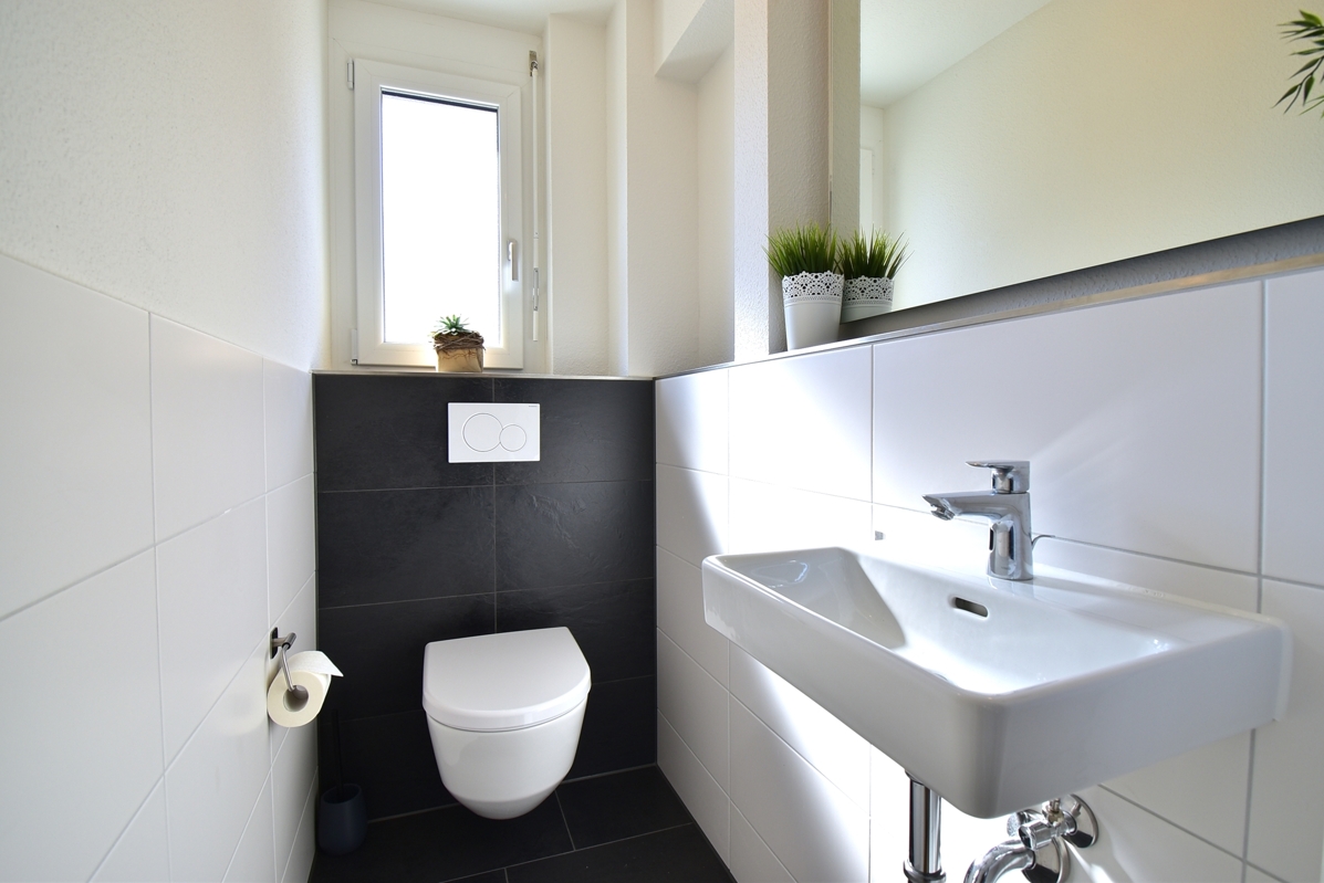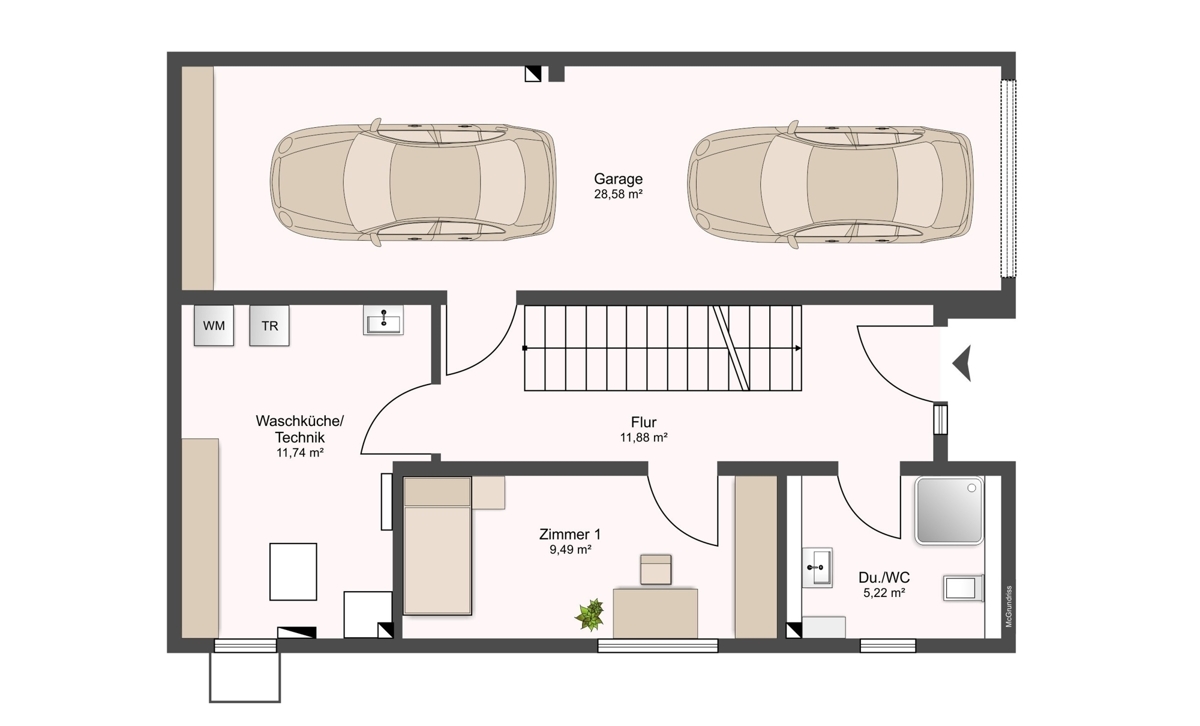 Sie betreten das Haus im Untergeschoss. Der Eingangsbereich bietet Platz für eine Garderobe und einen Schuhschrank. In dieser Etage befindet sich ein Gästezimmer sowie ein Tageslicht-Gästebad ausgestattet mit einer begehbaren Dusche, WC und modernem Waschbecken. Der Technik-/ Waschraum und die übergroße Garage, sowie ein Stellplatz am Haus, vervollständigen diese Ebene.