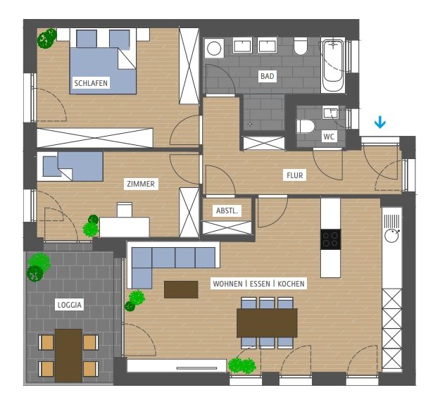 Diese helle 3-Zi.-Wohnung besitzt einen großzügigen Wohn- und Essbereich mit offener Küche. Im Wohn-Essbereich befinden sich drei bodentiefe Fenster. Die Süd-West-Loggia vergrößert den Wohnbereich und lädt zum draußen Verweilen ein. Von einem weiteren Zimmer haben Sie einen direkten Zugang auf die Loggia. Das moderne Tageslicht-Badezimmer ist mit einer Badewanne, einer begehbaren Dusche, 2 Waschbecken und einem WC ausgestattet. Zusätzlich gibt es ein separates WC und einen Abstellraum. Außerdem gibt es einen Kellerraum.Der Bezug ist ab sofort möglich. Haustiere sind erlaubt.