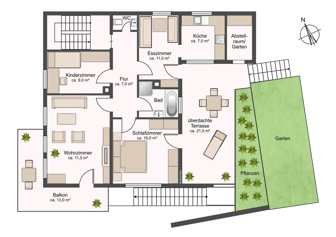 Küche (ca. 7 m²) und Essbereich (ca. 11 m²)