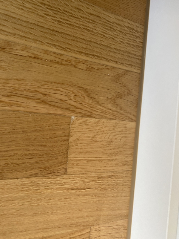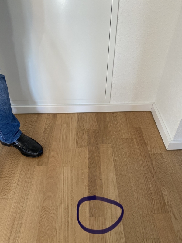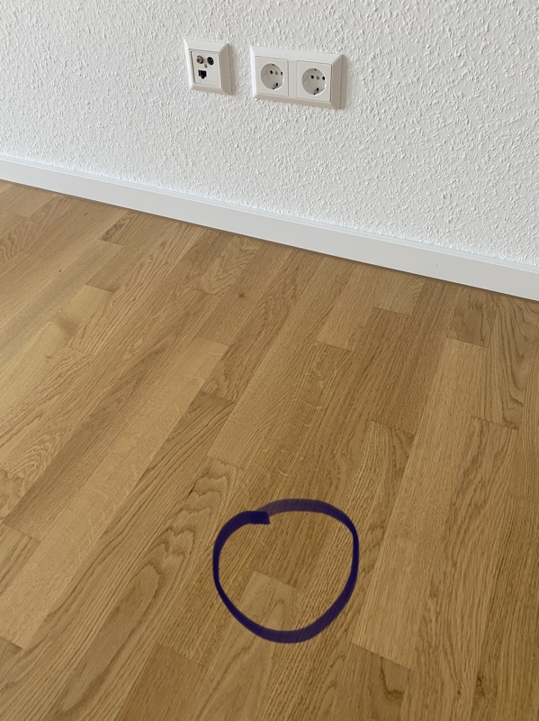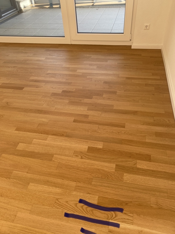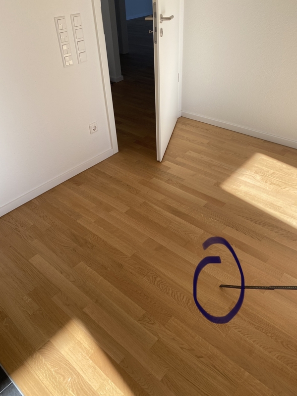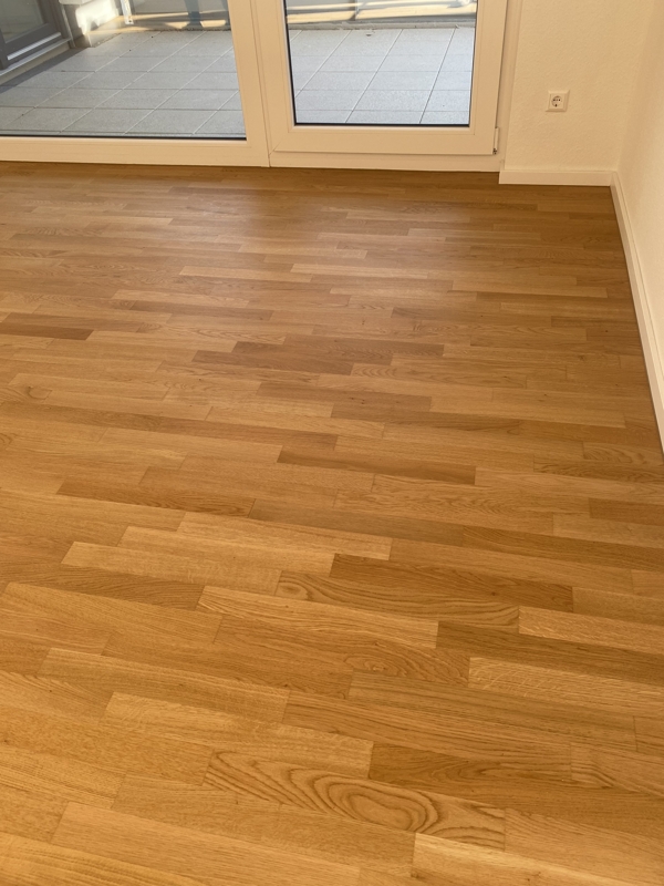 In den Wohnräumen und im Flur ist Parkett und in dem Küchen- und Sanitärbereich sind dunkle Fliesen verlegt.Aufteilung Wohnfläche: