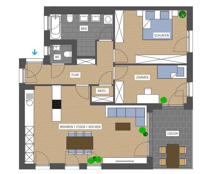 (Die Beispiel-Wohnung befindet sich in einem anderem Haus, jedoch gleiche Ausrichtung und Grundriss)