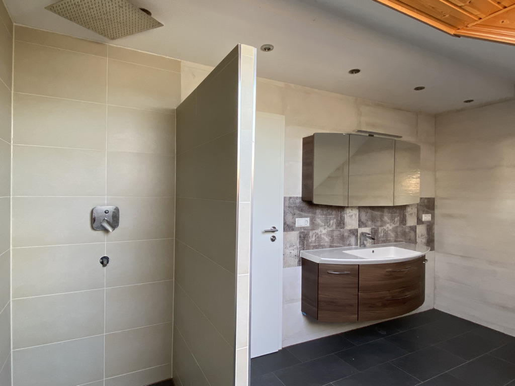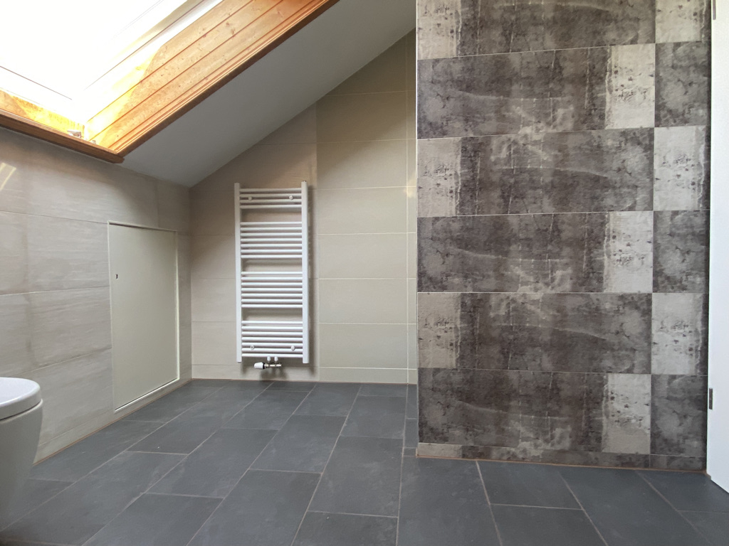 Ins Dachgeschoss gelangt man über eine Wendeltreppe.Dort befindet sich ein Schlafzimmer, zwei Kinderzimmer, ein Büroraum und ein separates WC. Außerdem gibt es ein modernes Tageslicht-Badezimmer mit Badewanne, begehbarer Regendusche, Waschbecken und WC. Es gibt zwei Balkone.