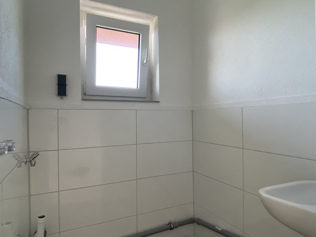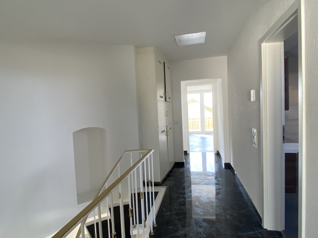 In der Hauptwohnung sind im Eingangsbereich und Wohnzimmer heller Naturstein verlegt. In den Wohn- und Schlafräumen im DG ist Laminat verlegt. Die Badezimmer und WCs sind gefließt. Der überwiegende Teil der Fenster sind kunststoff-isolierverglast. Böden, Wände und Decken sind teilweise renovierungsbedürftig.In der Einliegerwohnung ist in den Wohnräumen Laminat verlegt, im Badezimmer und WC Fließen. Die Fenster sind holz-isolierverglast aus dem Baujahr 1966 mit Außenjalousien. Böden, Wände und Decken sind renovierungsbedürftig.