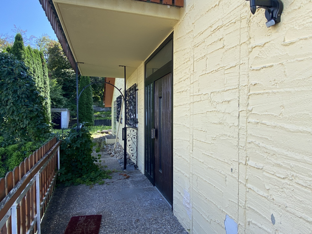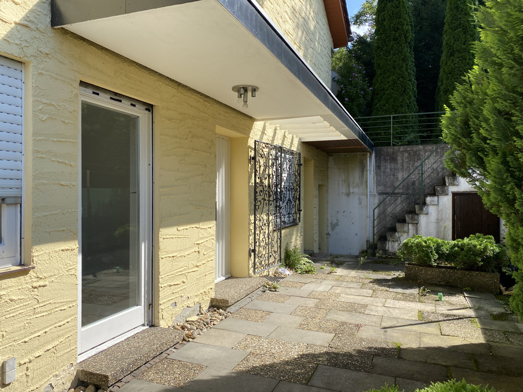 Über eine kleine Außentreppe gelangt man von der Straße zum Eingangsbereich der Einliegerwohnung (ELW) (Wfl. ca. 77 m² ohne Terrassenflächen). Durch die Hanglage hat die Einliegerwohnung volles Tageslicht. Diese Wohnung besteht aus einem Wohnzimmer, einem Küchenzimmer ohne Einbauküche, einem Badzimmer und einem Schlafzimmer. Vor dem Eingangsbereich gibt es eine kleine Terrasse.
