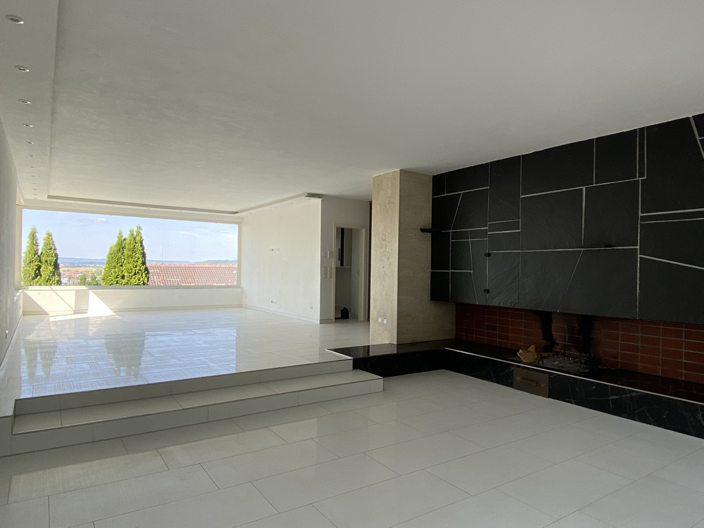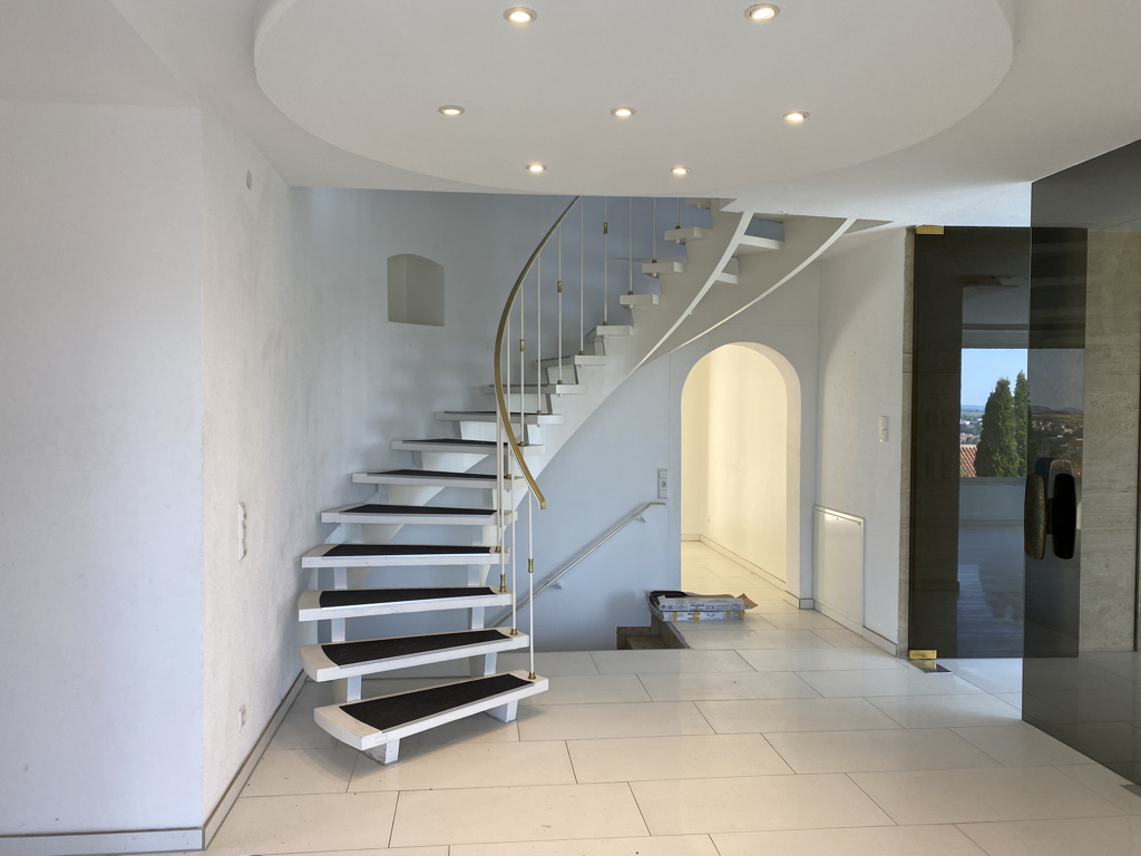 Die Hauptwohnung (Wfl. ca. 200 m² mit Terrassen- und Balkonflächen) befindet sich im Obergeschoss. Über eine Außentreppe gelangt man zu der Eingangstüre der Hauptwohnung. Die Wohnung verfügt über ein ca. 67 m² großes Wohnzimmer mit offenem Kamin. Zur Straße hin blickt man durch eine große Fensterfront über Winnenden, auf der anderen Seite kann man den Blick in den Garten genießen. Über eine Schiebetüre gelangt man hier in den Garten. Es gibt einen abgeschlossenen Küchenraum (In der Küche befindet sich eine Einbauküche mit Geräten. Der Mieter kann diese Küche ohne zusätzliche Kosten und ohne jede Gewähr benutzen).Besonders schön ist der helle, großzügige Eingangsbereich mit Garderobe, separatem WC und Hauswirtschaftsraum. Über das Esszimmer gelangt man zu der überdachten Terrasse und in den Garten. Im Garten gibt es einen kleinen Geräteschuppen.