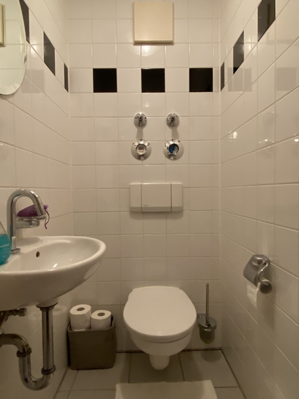 WC separat, innenliegend, das WC ist deckenhoch hell gefliest.
