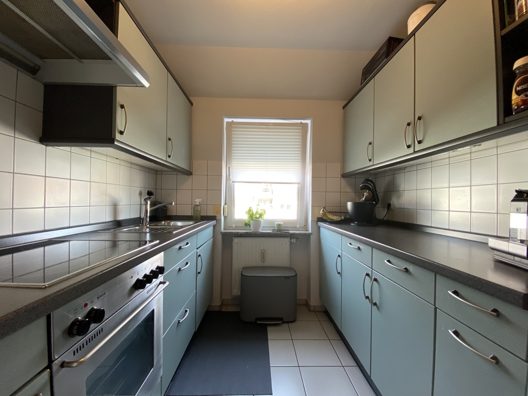 Küche: separater Küchenraum mit älterer Einbauküche und Geräten.