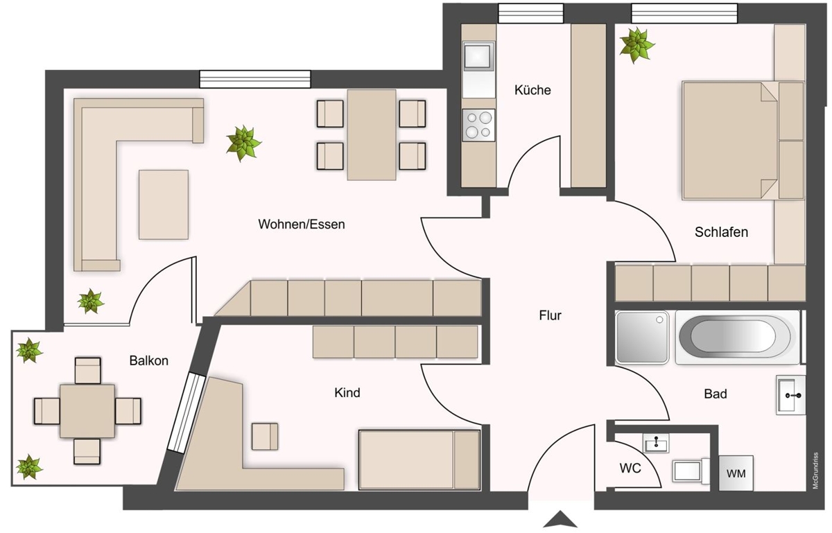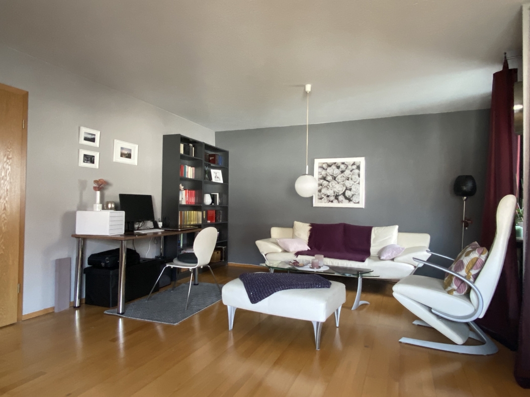 Das Wohnzimmer besteht aus einem großzügigen, offenen Wohn-/Essbereich, der aus Wohnzimmer und einem separat geplanten Kinderzimmer besteht. Im Wohnzimmer liegt Parkett. Vom Wohnzimmer aus geht es auf den quadratisch geschnittenen Balkon.