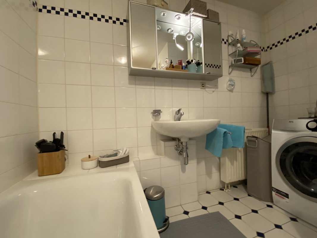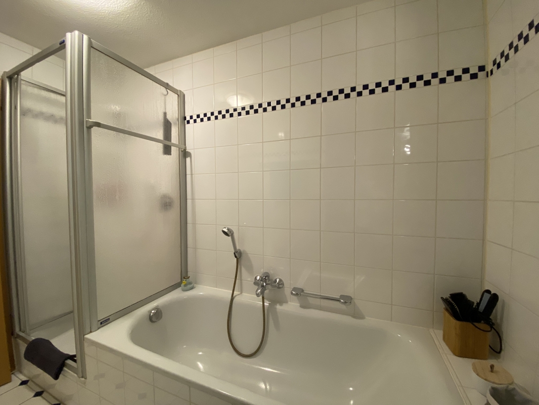 Badezimmer innenliegend, ausgestattet mit Badewanne, Dusche, Waschbecken und Waschmaschinenplatz. Das Bad ist deckenhoch hell gefliest.