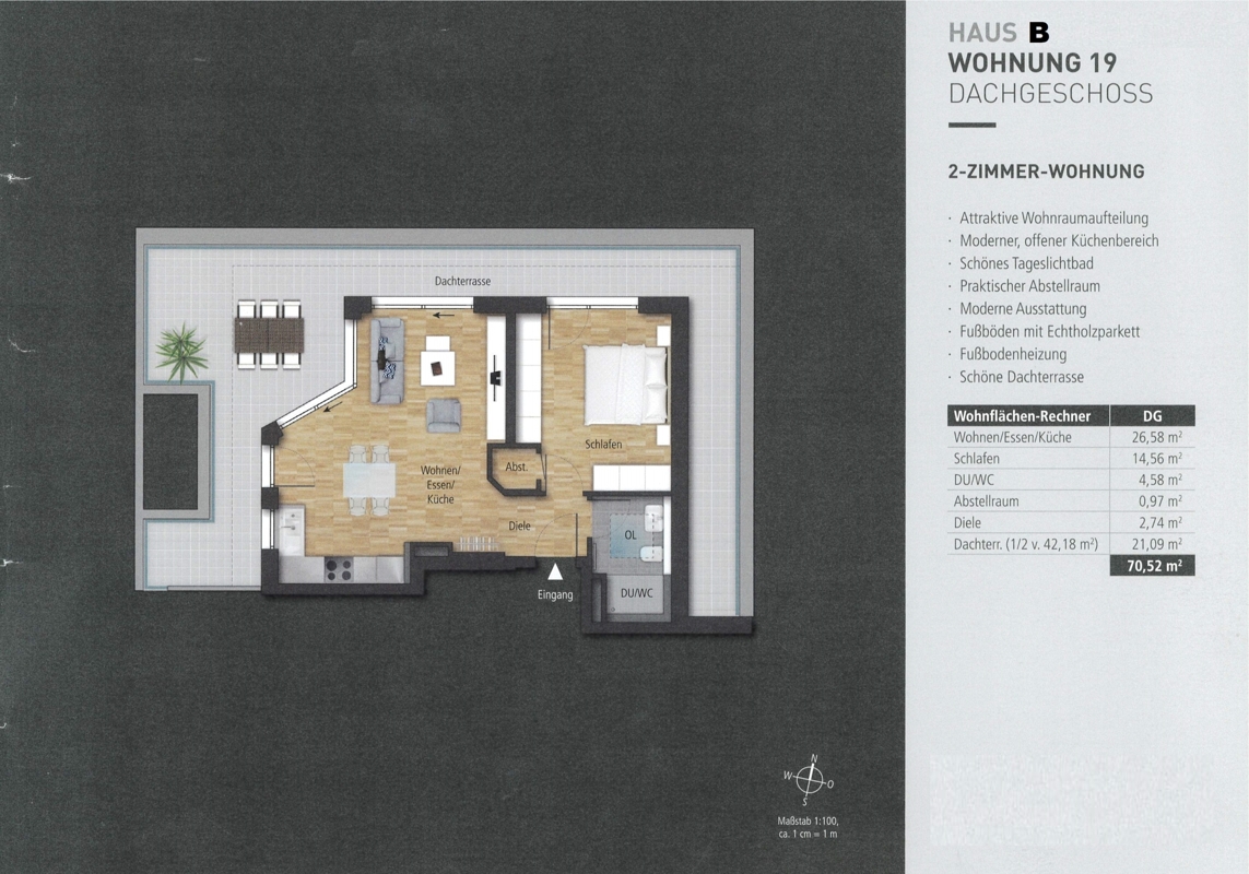 Dachterrasse ca. 21 m² (zu 50% angerechnet, Grundfläche ca. 42 m²)
