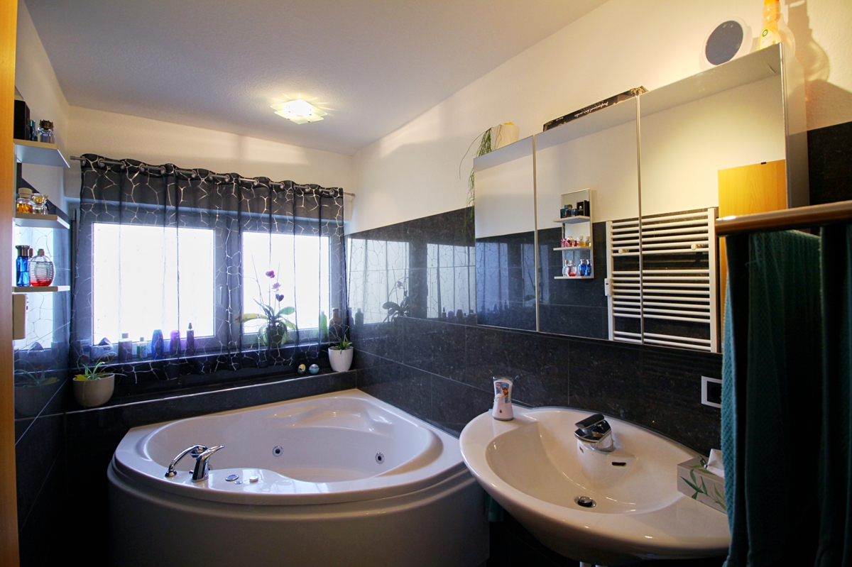 Badezimmer mit Eckbadewanne und FensterBadezimmer mit innenliegend mit großer Dusche