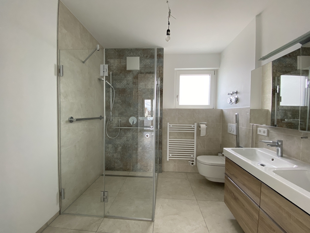 - Tageslichtbadezimmer (ca. 6 m²) mit Schiebetüre und mit bodengleicher Dusche mit Glasabtrennung, Doppelwaschbecken mit hochwertigem Unterbau und Spiegelschrank, Handtuchwärmer und WC mit Aqua Clean Comfort WC/Bidetfunktion.
