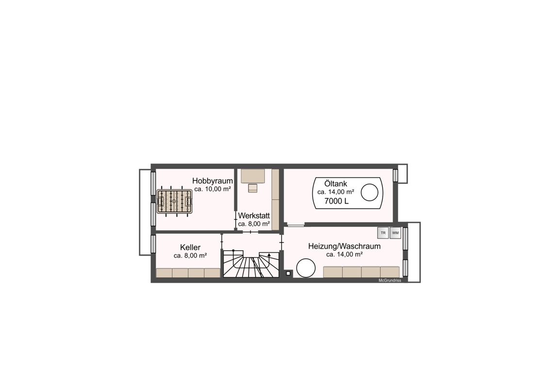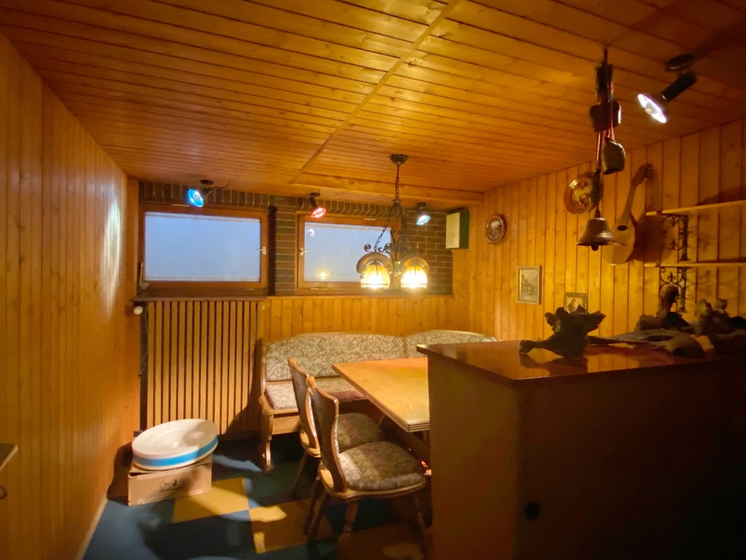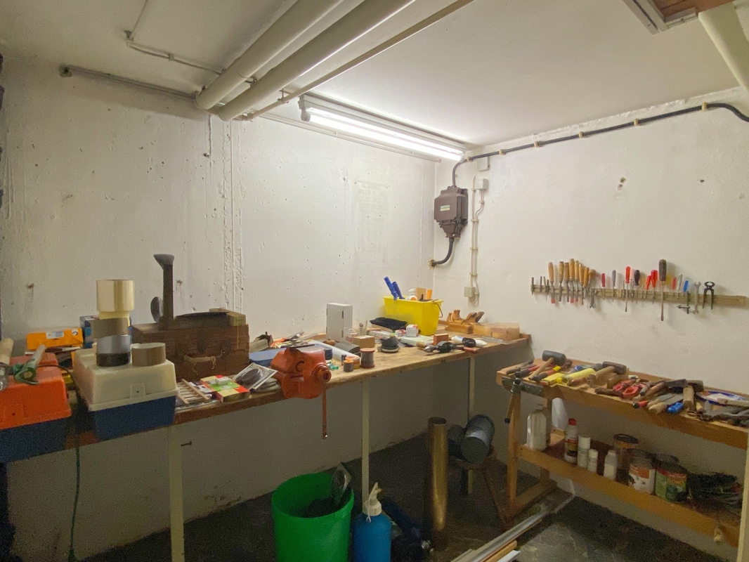 Im Untergeschoss gibt eine Werkstatt und ein Hobbyraum. Einen Keller für die Vorräte und einen Heizraum mit Waschmaschinenanschluss und Ausgußbecken mit Warm- und Kaltwasseranschluss.