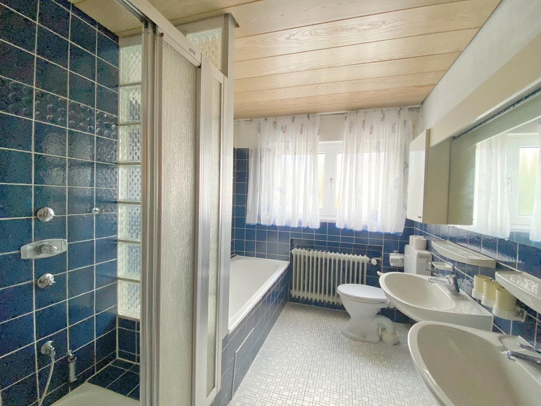 Badezimmer mit WC, zwei Waschbecken, Dusche und Badewanne (ca. 7 m²)