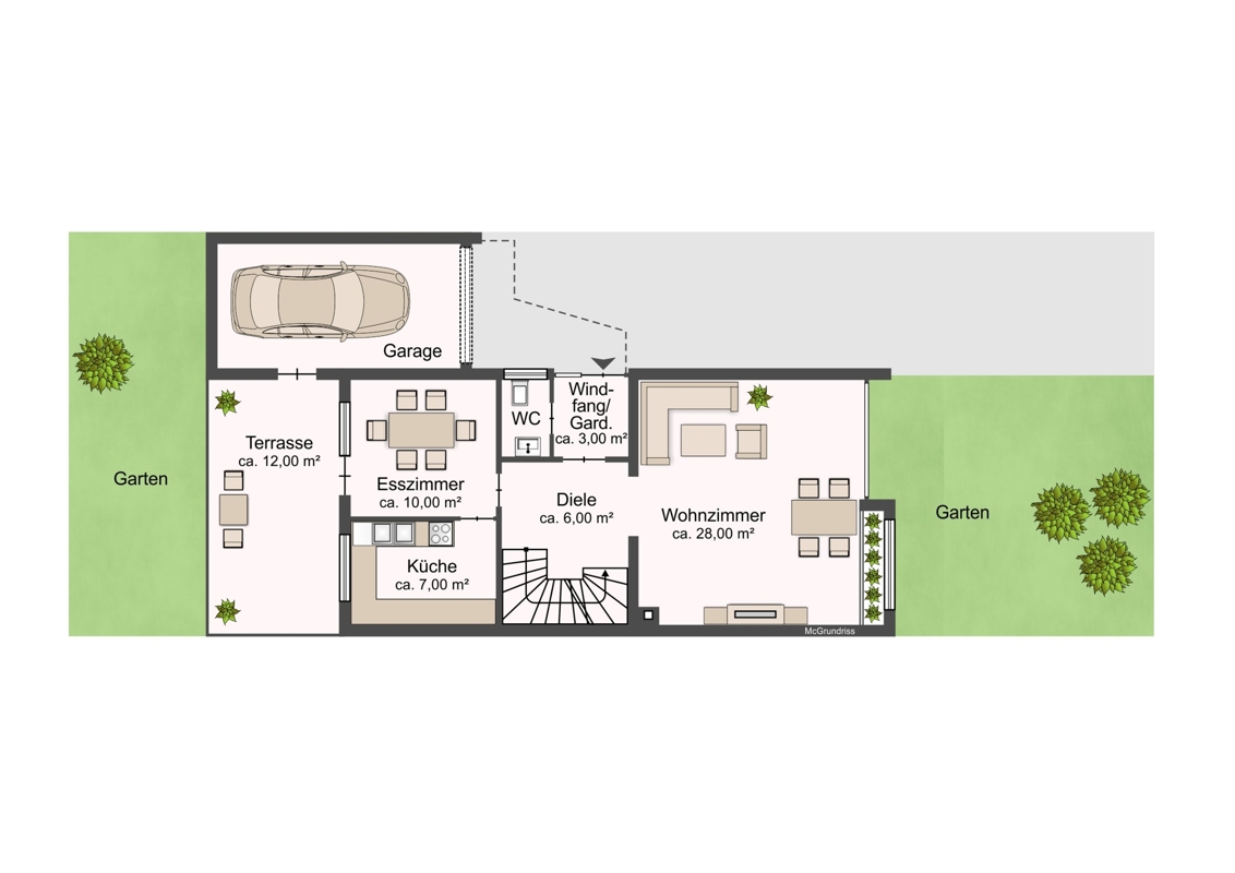 In der gemauerten Garage gibt es Platz für ein Auto mit Zugang auf die Terrasse