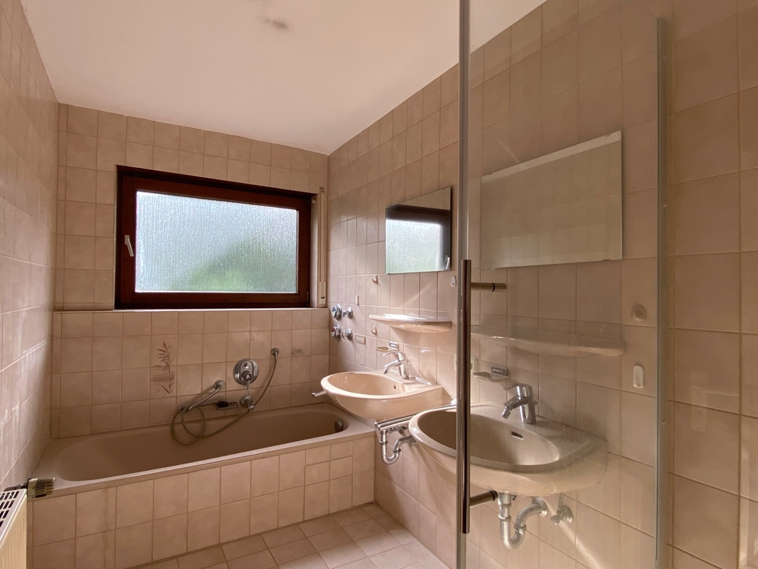 Badezimmer mit 2 Waschbecken, Badewanne und Dusche, ca. 5 m²