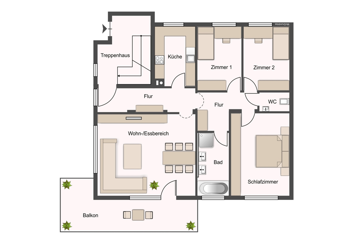 Vom Wohn-/ Essbereich gelangt man auf den Süd- und West-Balkon. Der Balkon bietet Möglichkeiten sich aufzuhalten und zu entspannen. Auf der Südseite vom Balkon gibt es eine Markise als Sonnenschutz. In der Wohnung haben Sie zusätzlich zwei weitere Zimmer und ein Schlafzimmer und eine abgeschlossene Küche. Das Tageslicht-Badezimmer ist ausgestattet mit zwei Waschbecken, einer Dusche und einer Badewanne. Die Wohnung verfügt über ein separates WC und einen großzügigen Flurbereich.
