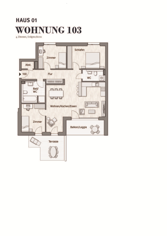 Alle Wohnungen orientieren sich nach Süden. Teilweise raumhohe Fenster sowie große Terrassen und Loggien – zugänglich vom Wohn-/Essbereich – öffnen den Wohnraum nach außen. Die Wohnungen im Erdgeschoss sind mit sonnige Südterrassen ausgestattet und haben einen eigenen Gartenanteil, welcher durch eine Bepflanzung mit heimischen Gehölzen eingefasst wird.